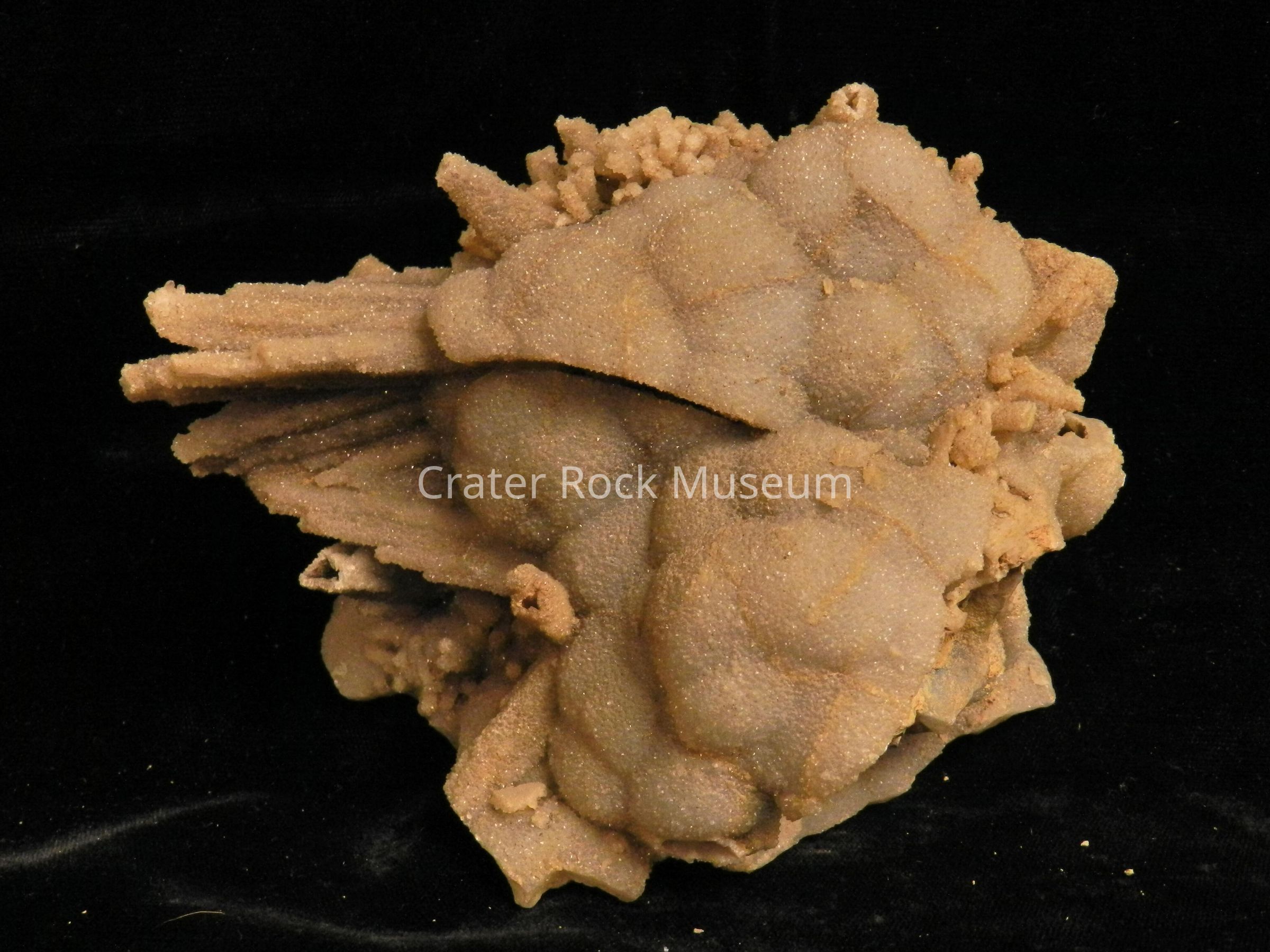 Description: (Delmar) Quartz and calcite from interior of geode. Colors: Fine and medium crystalline quartz in gray, blue, and white with calcite crystals in various shapes and sizes from short crystals to long spaghetti-shaped crystals. Blue agate with ochre or beige stains seen.Collection