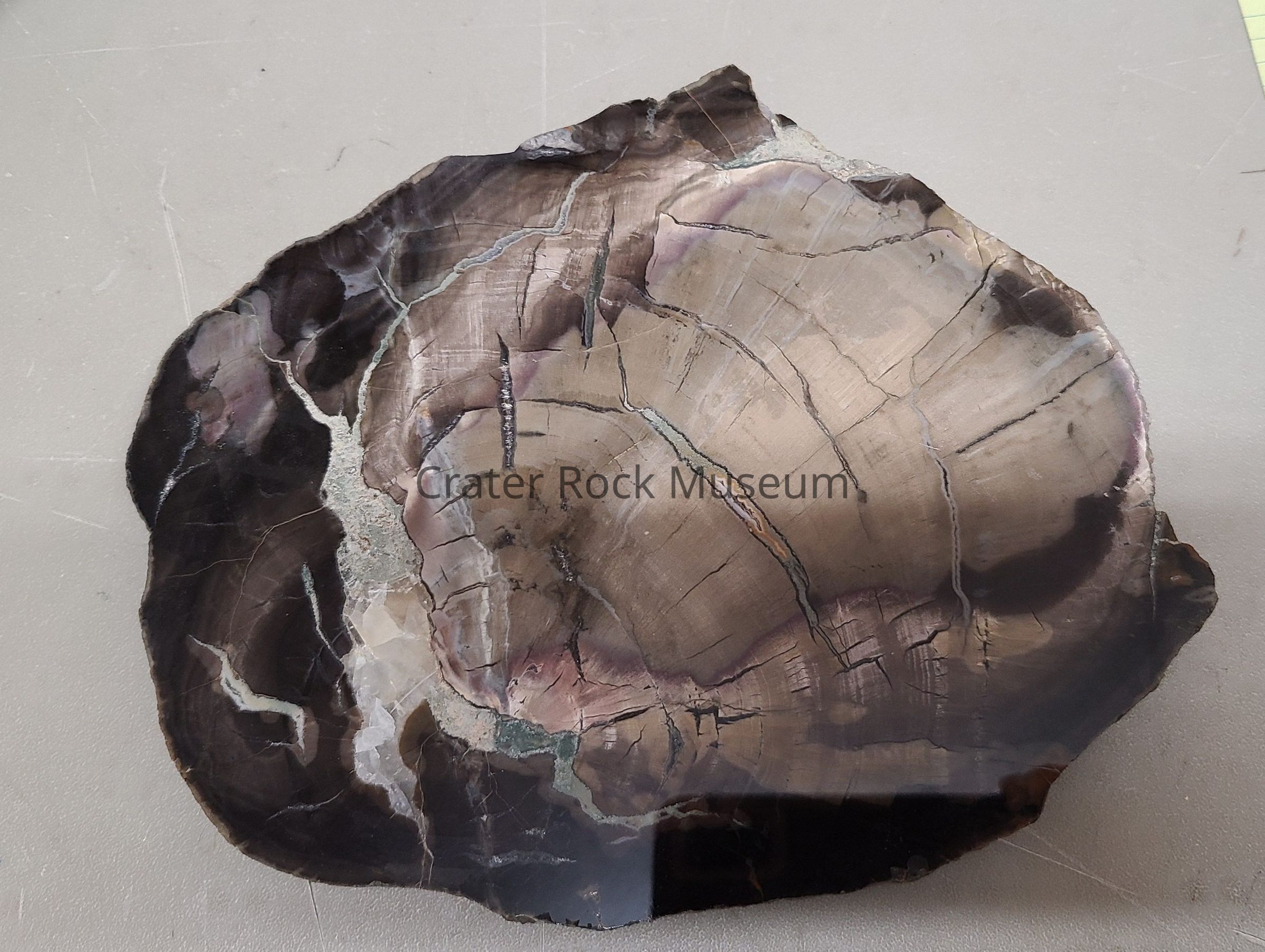 Description: Delmar describes this piece of petrified wood as a variety 'Woodworthia'. The polished side shows wood in brown, beige, pink, purple, black, and gray, some pale yellow with green cracks (copper) and crystal cracks.