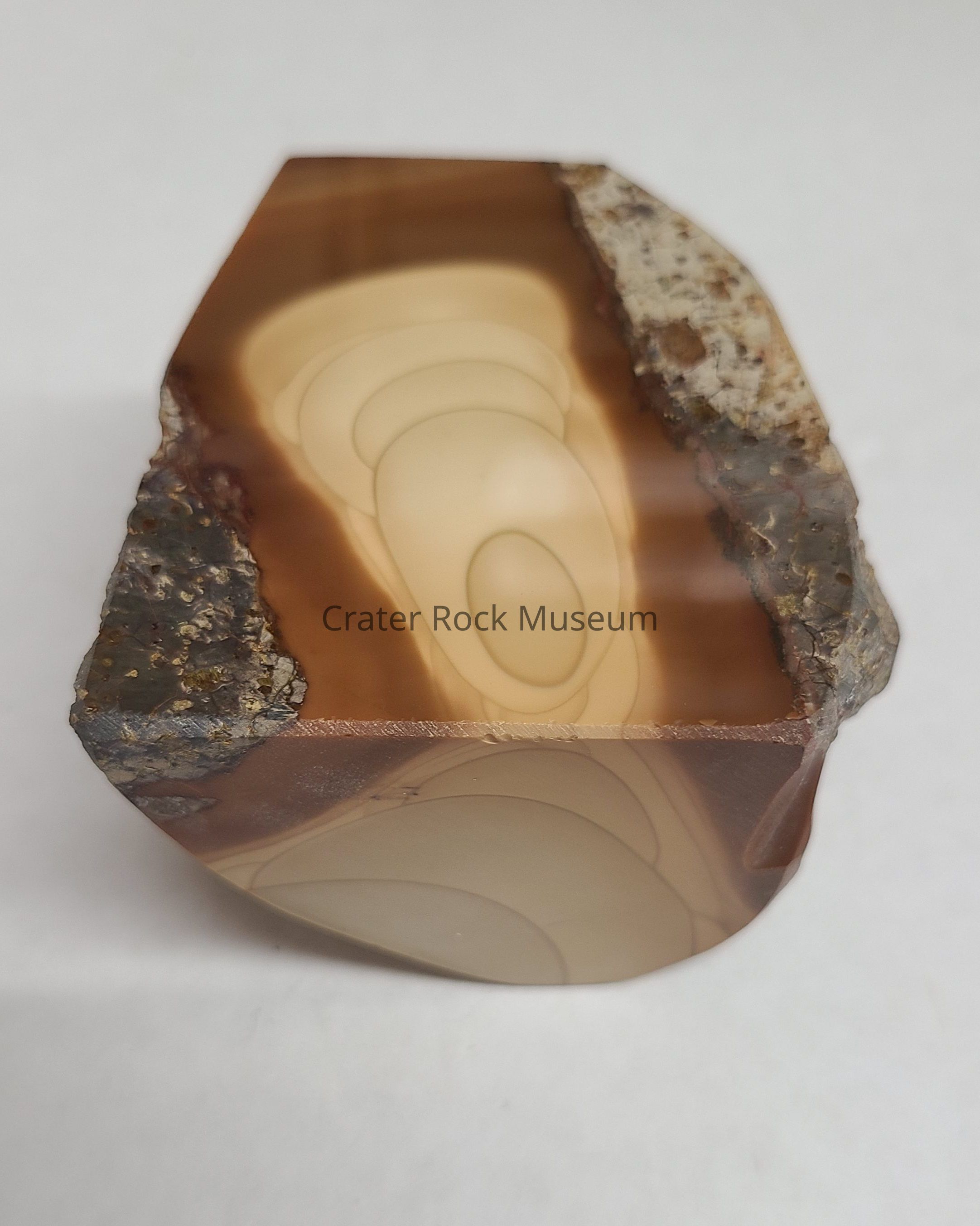 Description: Bruneau Jasper. Irregular piece with one polished face. Light tan series of concentric ellipses within a dark tan, banded matrix. Gray rock on two outer edges.