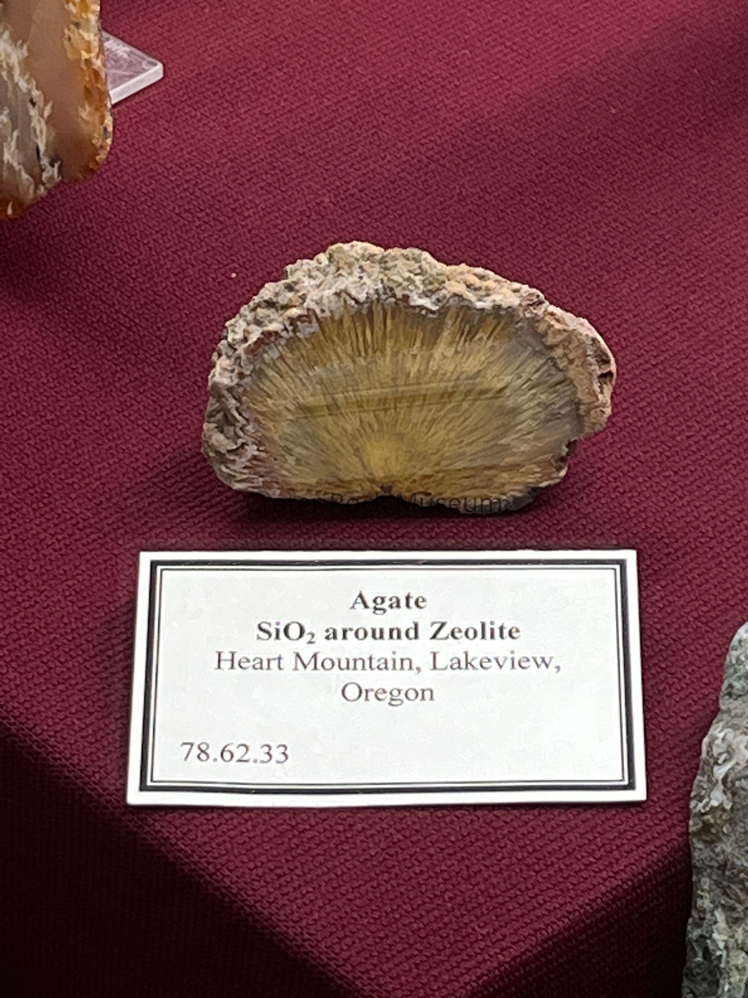 Description: (Delmar) A piece of zeolite (silicate mineral). Cut side shows gold zeolite with crystalline silicate filler. Surrounding rock is red and pink. Variety: Feather Zeolite.Collection