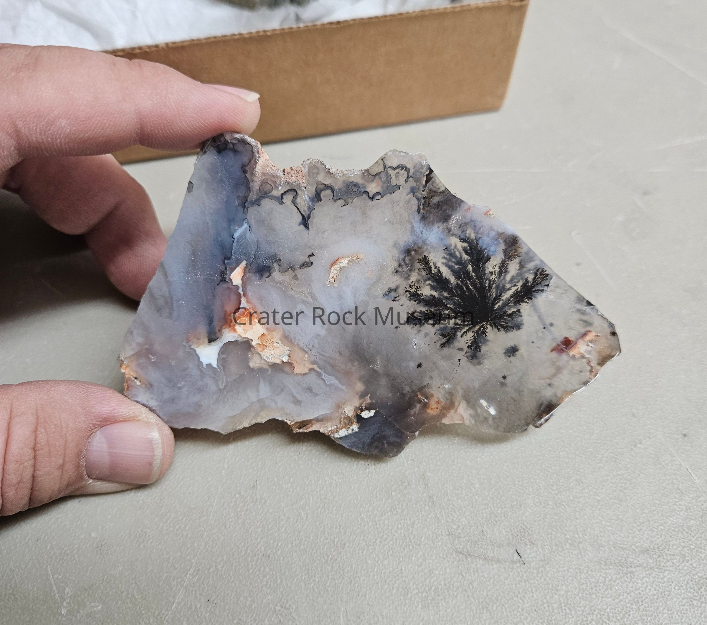 Description: (Delmar) A piece of agate with a dendritic 'spray'. Polished side shows clear, gray, and white agate, with a black dendritic 'spray'. Pink opaque rock is seen throughout piece. (As displayed on shelf: 33 small pieces, 2 larger pieces of dendritic agate.)Collection