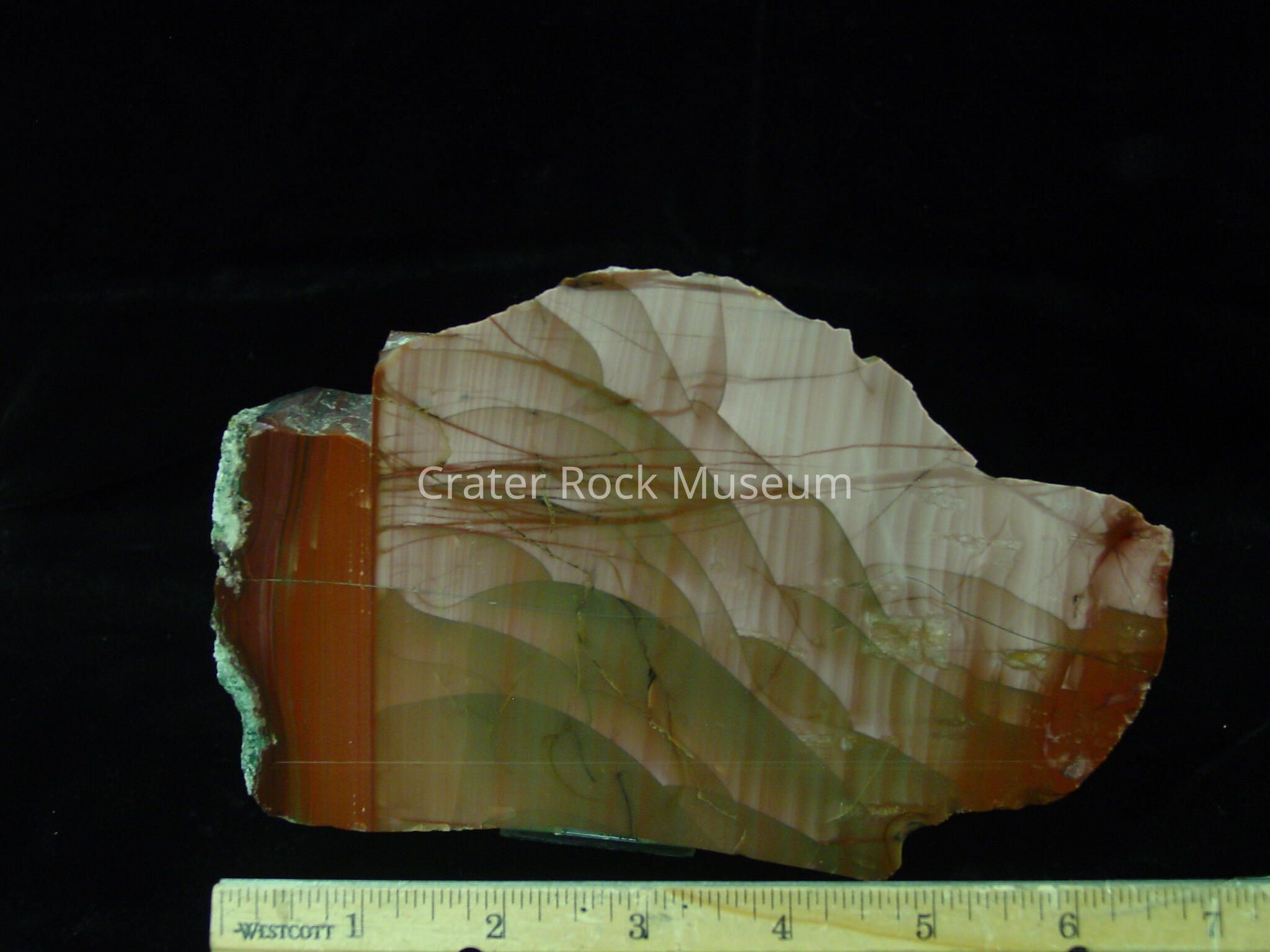 Description: Bruneau Jasper. Thick piece with polished face. Reddish-brown banding on both ends, with subtle light-brown banding in center. Perpendicular to banding, dark-to-light contours create a 'Chinese watercolor' effect of hills fading off into the distance.Collection
