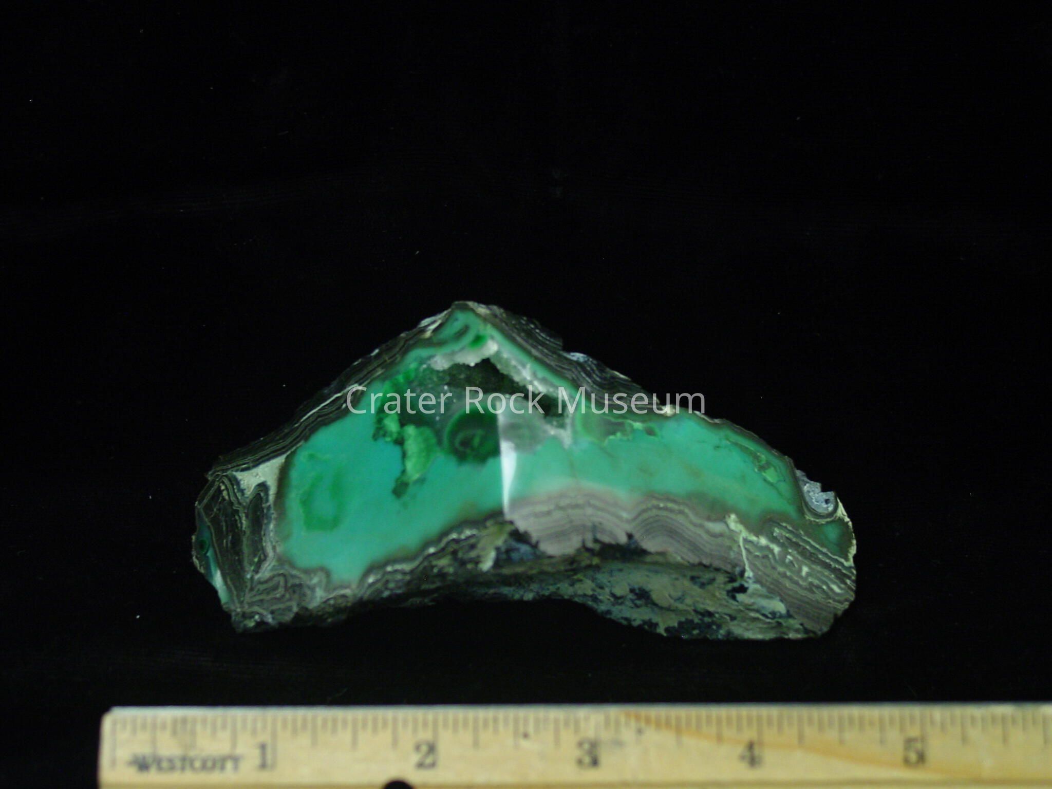 Description: (Delmar) One triangular chunk of chrysocolla. Polished on two sides with some quartz crystal in hollow. An electric blue mineral, hydrous copper silicate, found where copper minerals have been reached by ground water solutions. Mixed with quartz (silicon dioxide) to form a mineral rock. Found in copper beds of Arizona. Electric blue, green, black, and white quartz crystal.Collection
