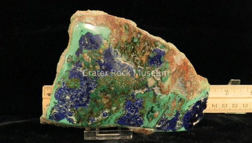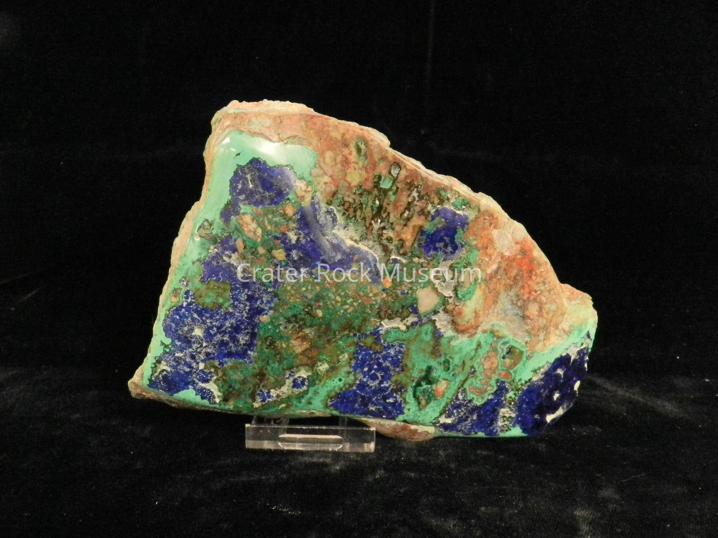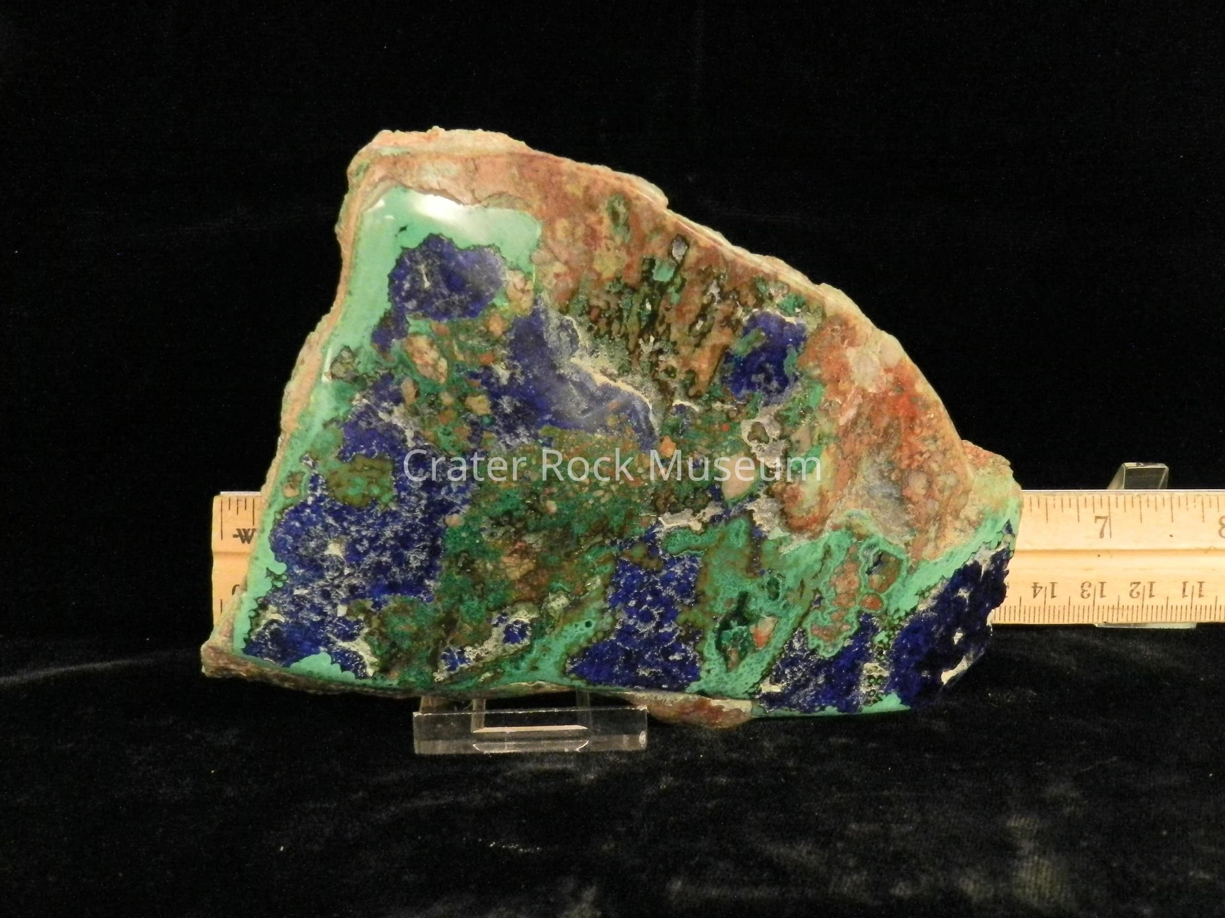 Description: A deep blue azurite (blue copper carbonate) and green malachite (green basic copper carbonate) mixture, probably from Bisby, Arizona. Surface is bumpy (botryoidal texture) or vesicular. Piece is more or less tabular.