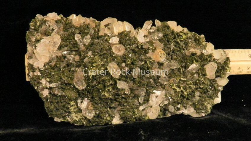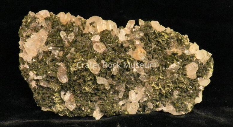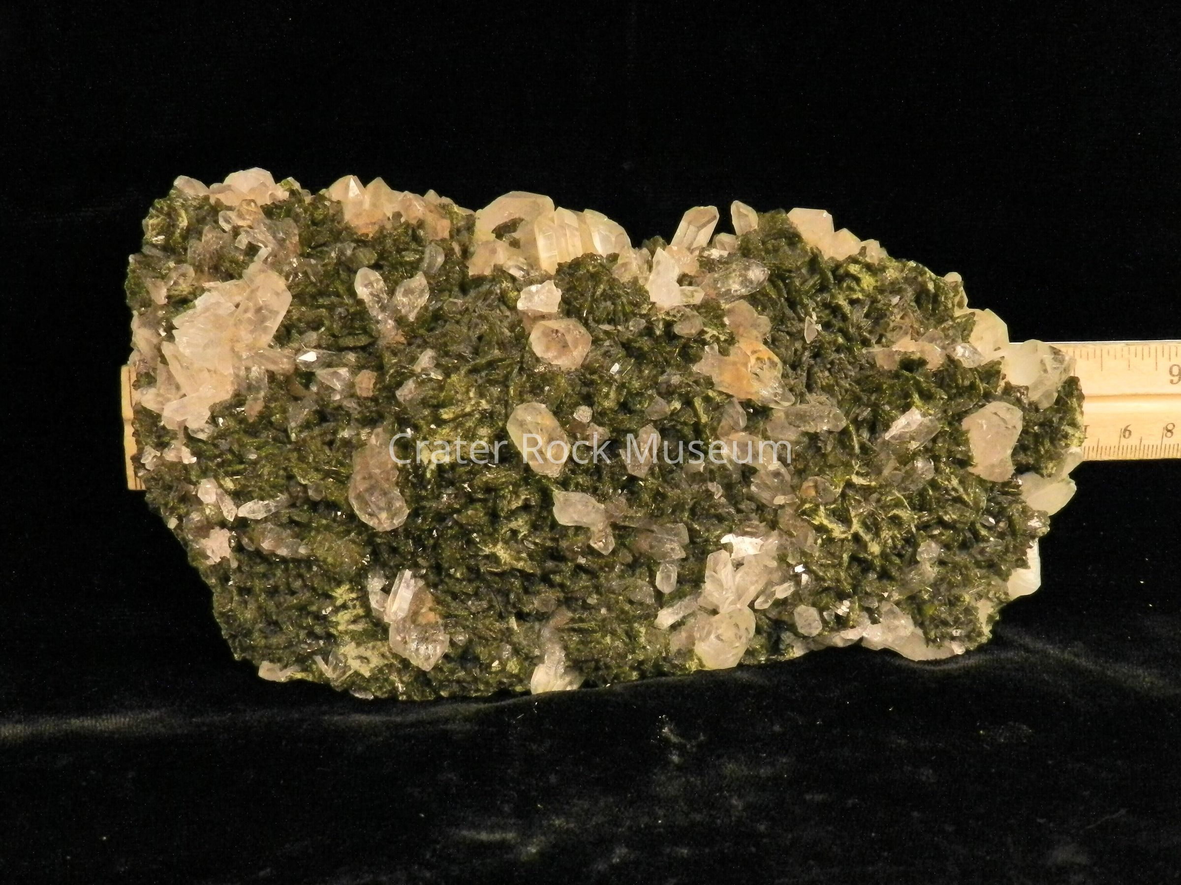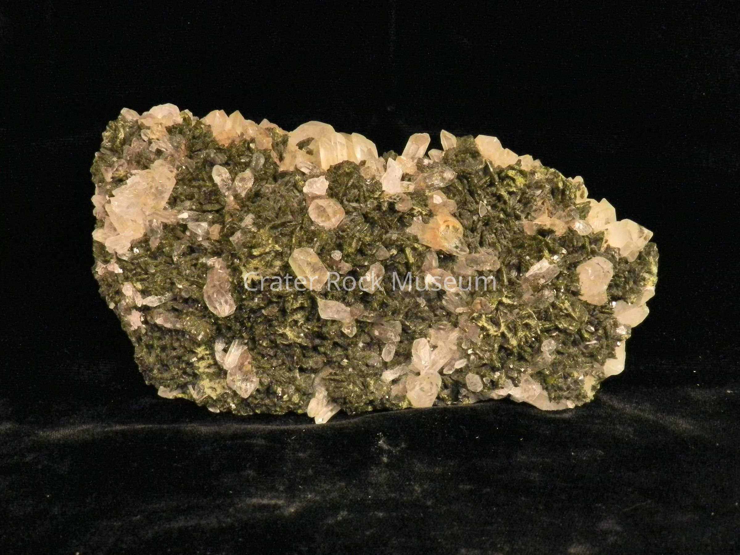 Description: Perfect crystals of clear quartz rising out of bed of tiny (almost fur-like) crystals of hornblende with a deep green color. (Note: hornblende may actually be epidote, actinolite, etc.: check)