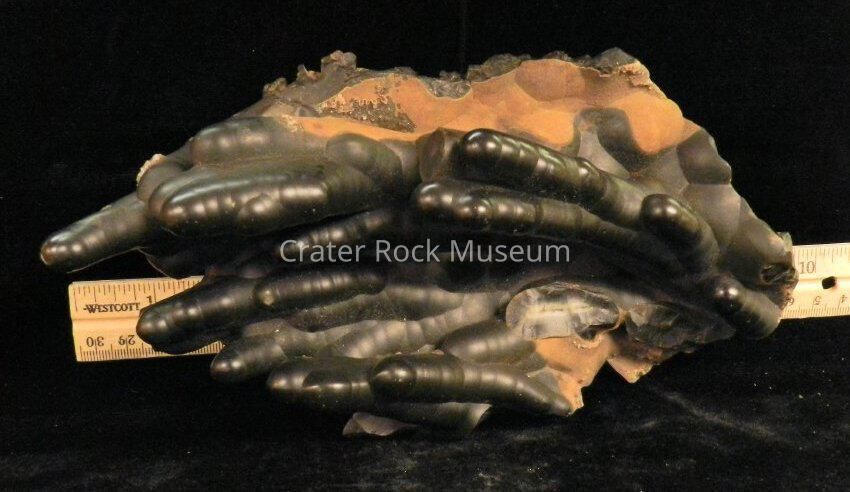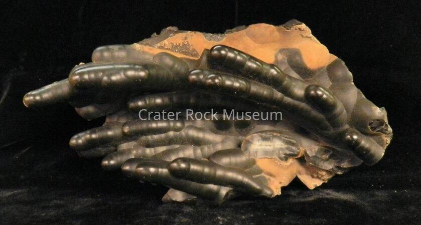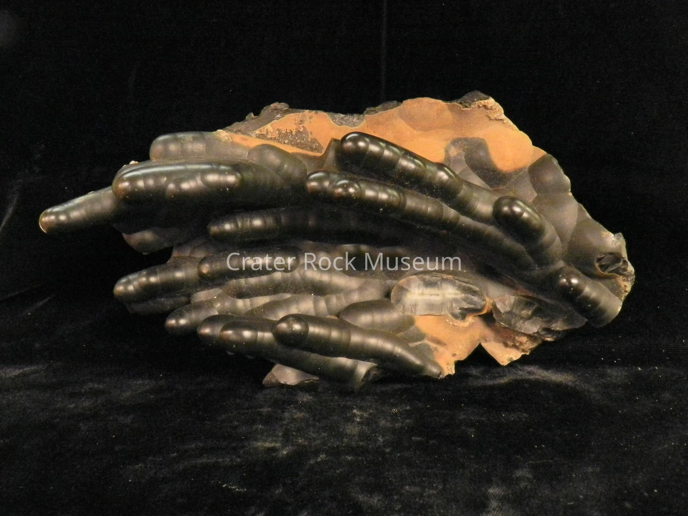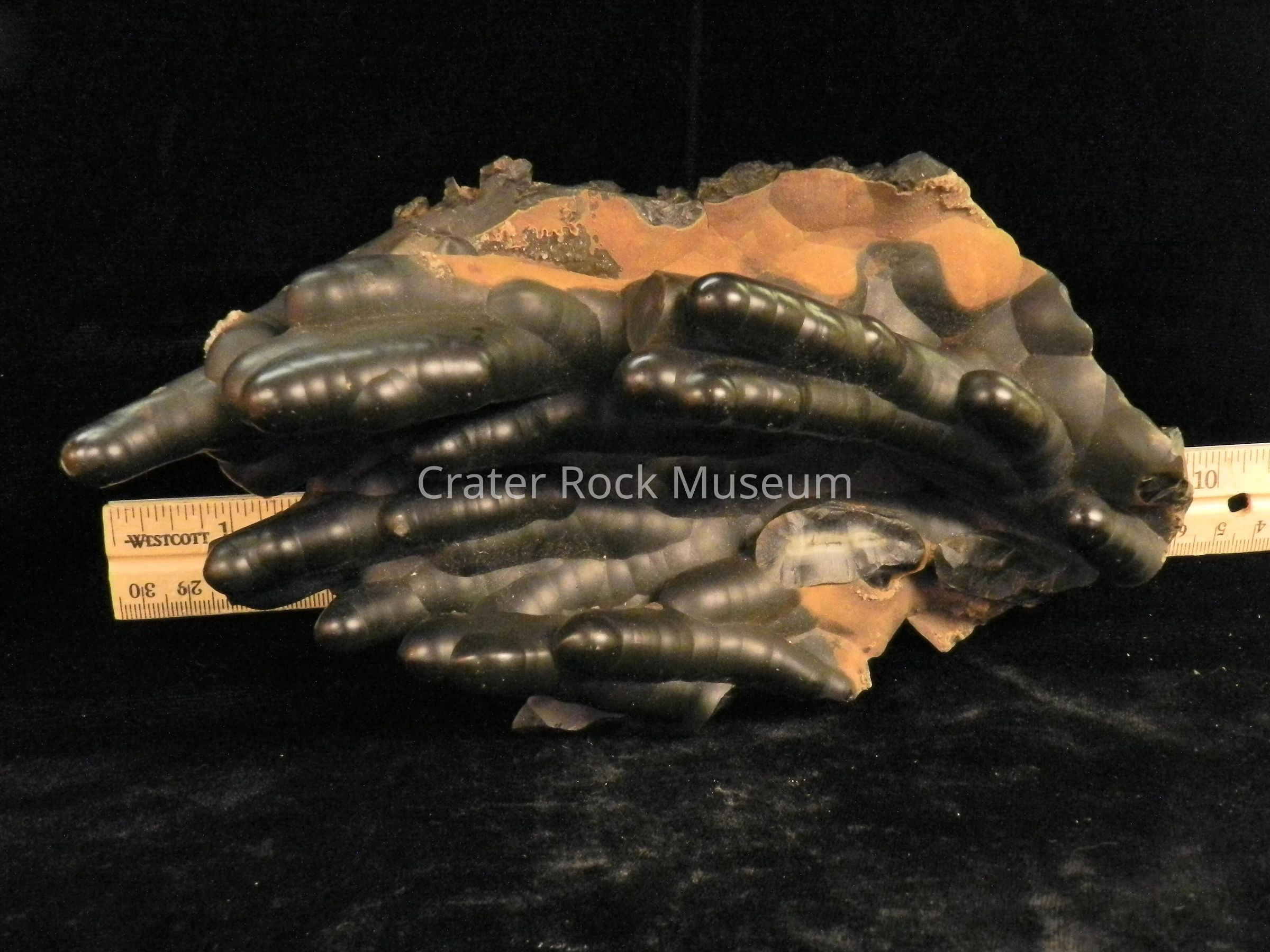 Description: Many smooth, black projections from base matrix. Overall shape is halfway between a fossilized coral look and a stalagmite look.