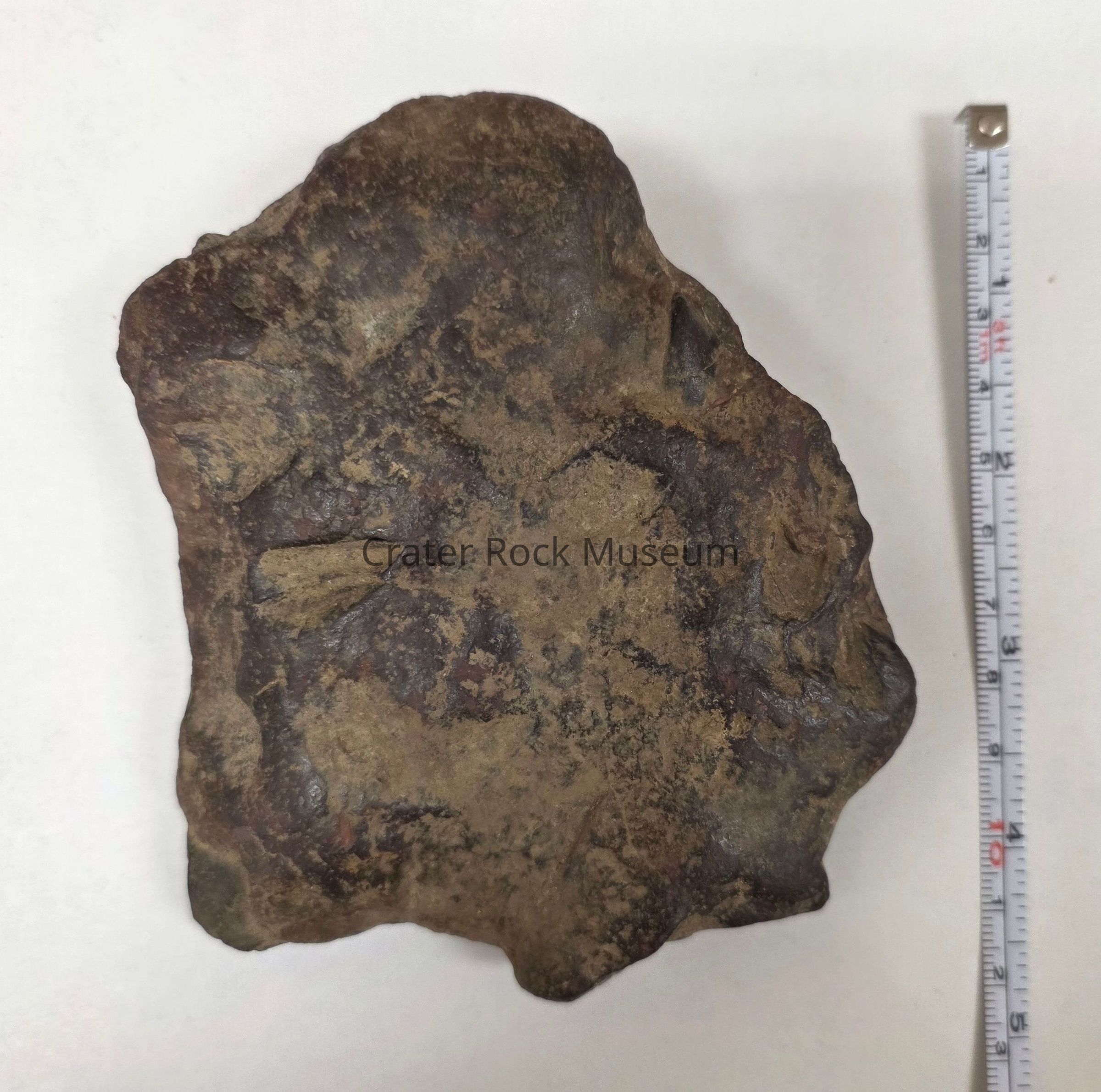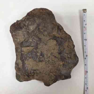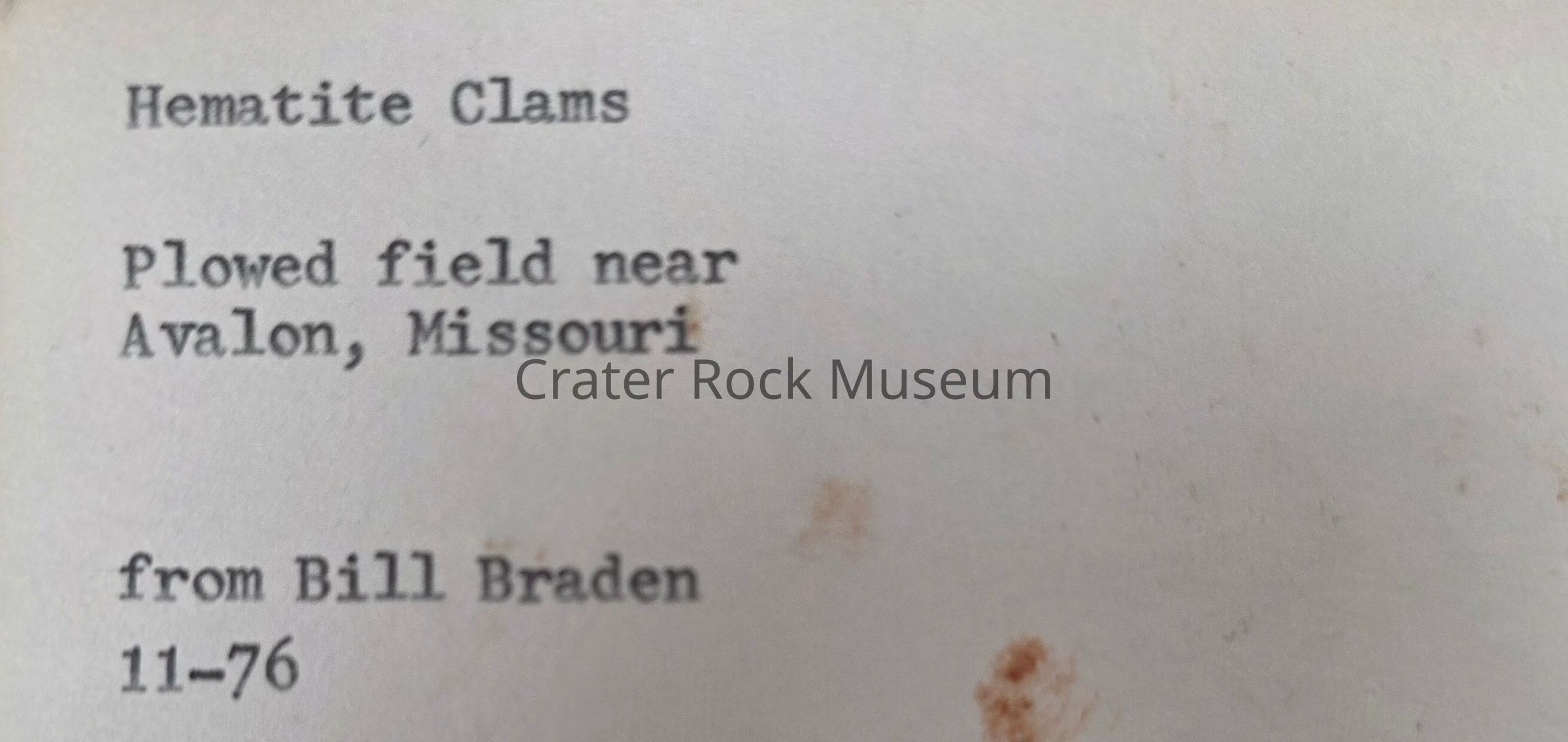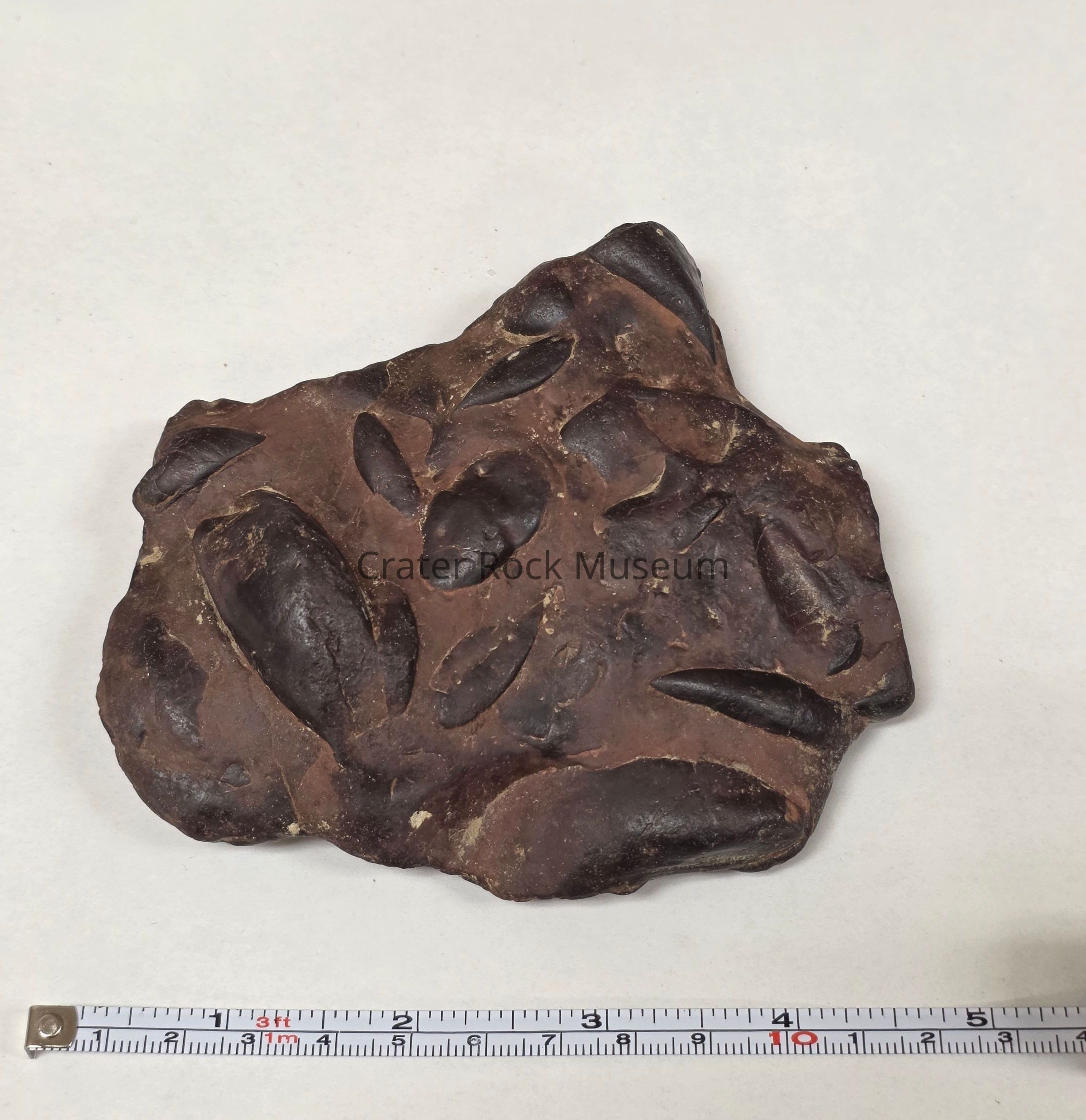 More than a dozen partially exposed dark brown clams in a lighter red-brown matrix.Location