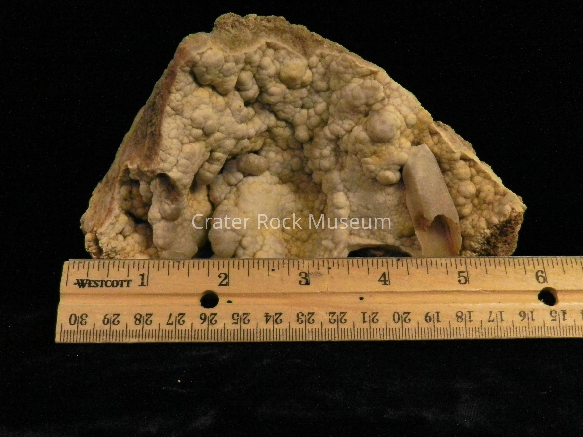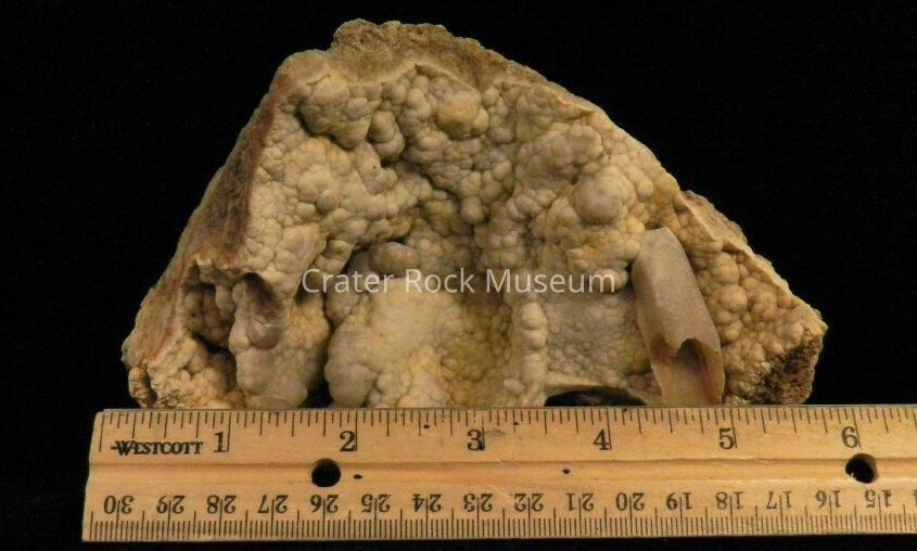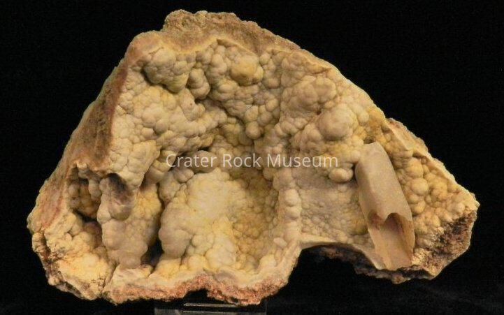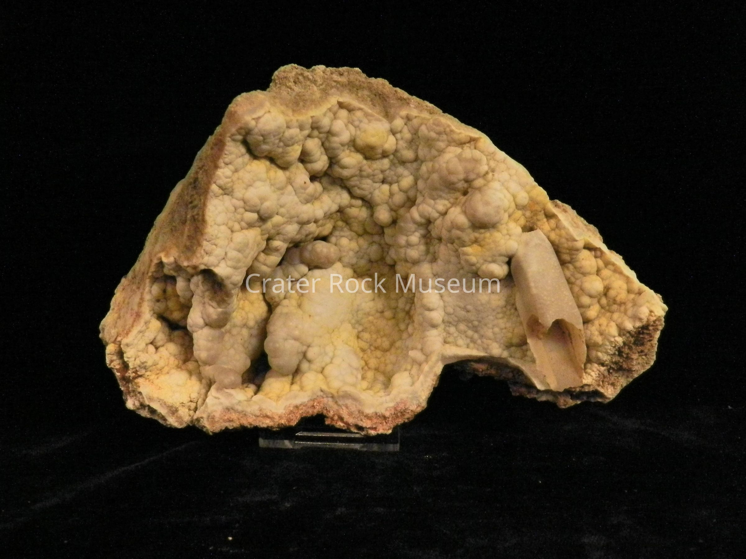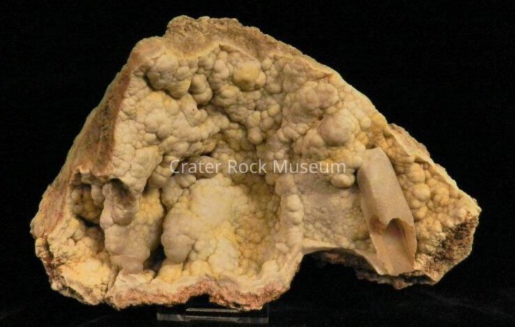Description: Boytoidal quartz on interior of geode-like shape. Quartz is opaque in off-white to creamy-white color, with surrounding crust in tans.