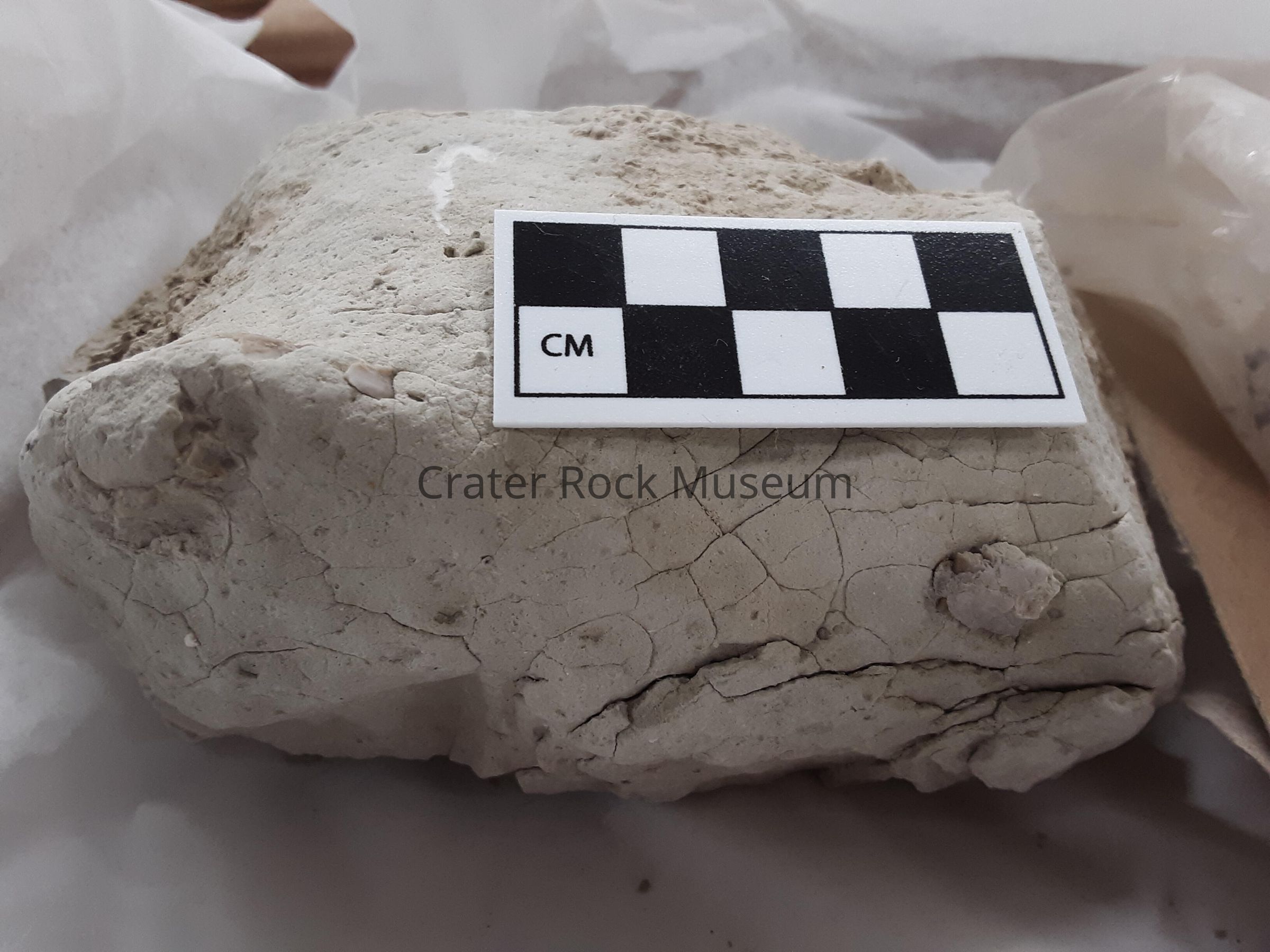 On the left of the image there is a tan-brown patch of either bone or tooth enamel, still mostly buried in the matrix. On the right, there is a tiny jaw fragment almost the color of the matrix with tan-brown tooth fragments/roots showing through on both the dorsal and ventral sides. Rodent or lagomorph?