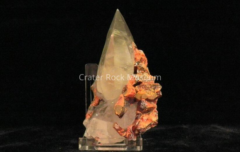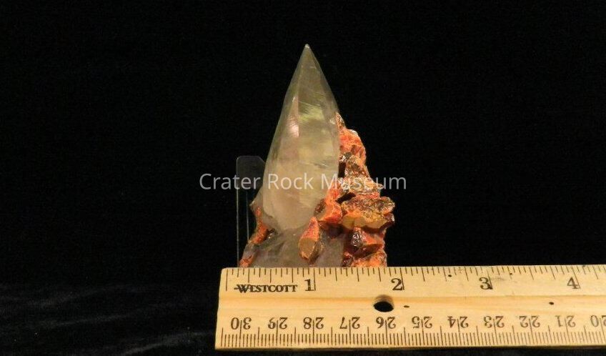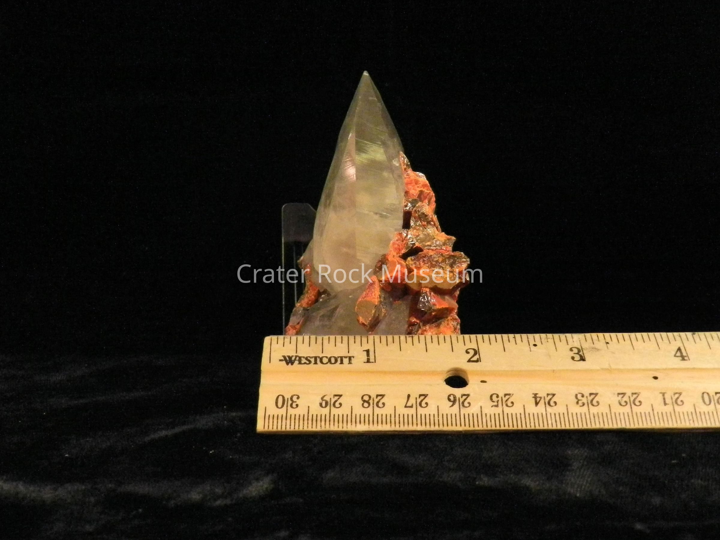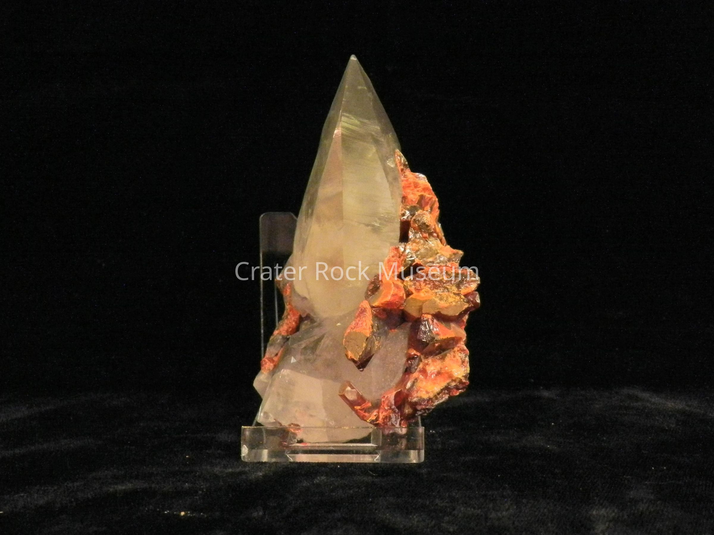 Description: Smaller, red cinnabar crystals around base of semi-transparent, larger quartz crystal.