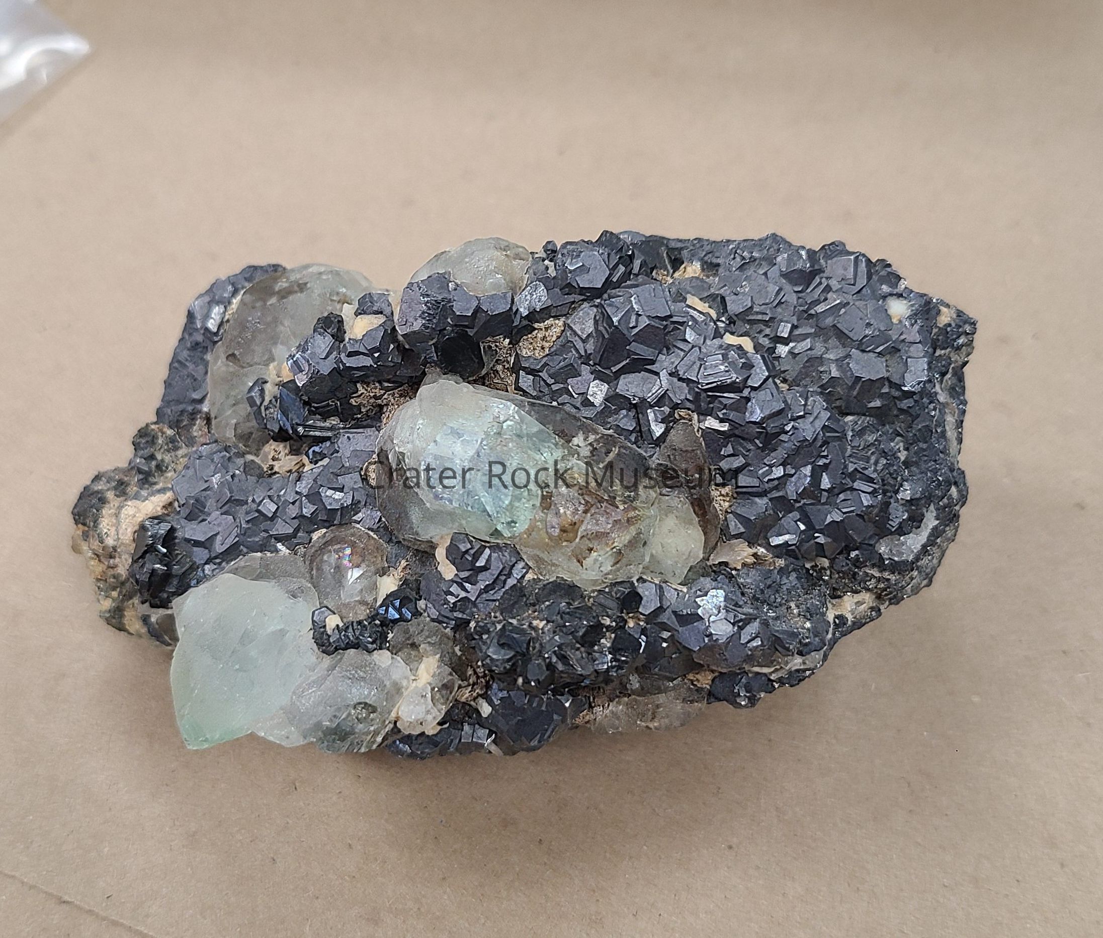 Description: Small, black ferberite crystals as a matrix, with intermixed areas of light blue to light green fluorite crystals on one side of the specimen, with small groupings of clear quartz crystals on the back.