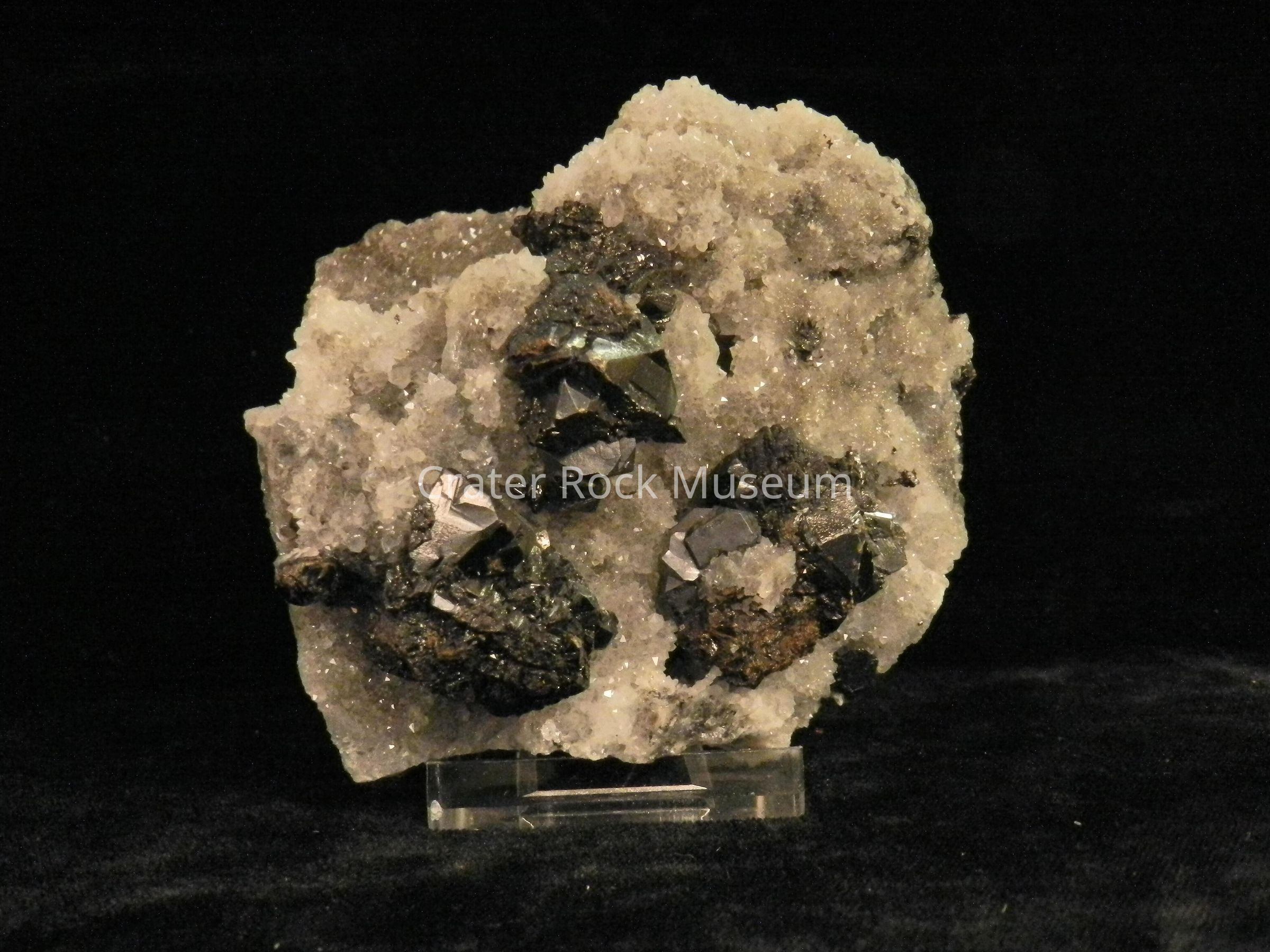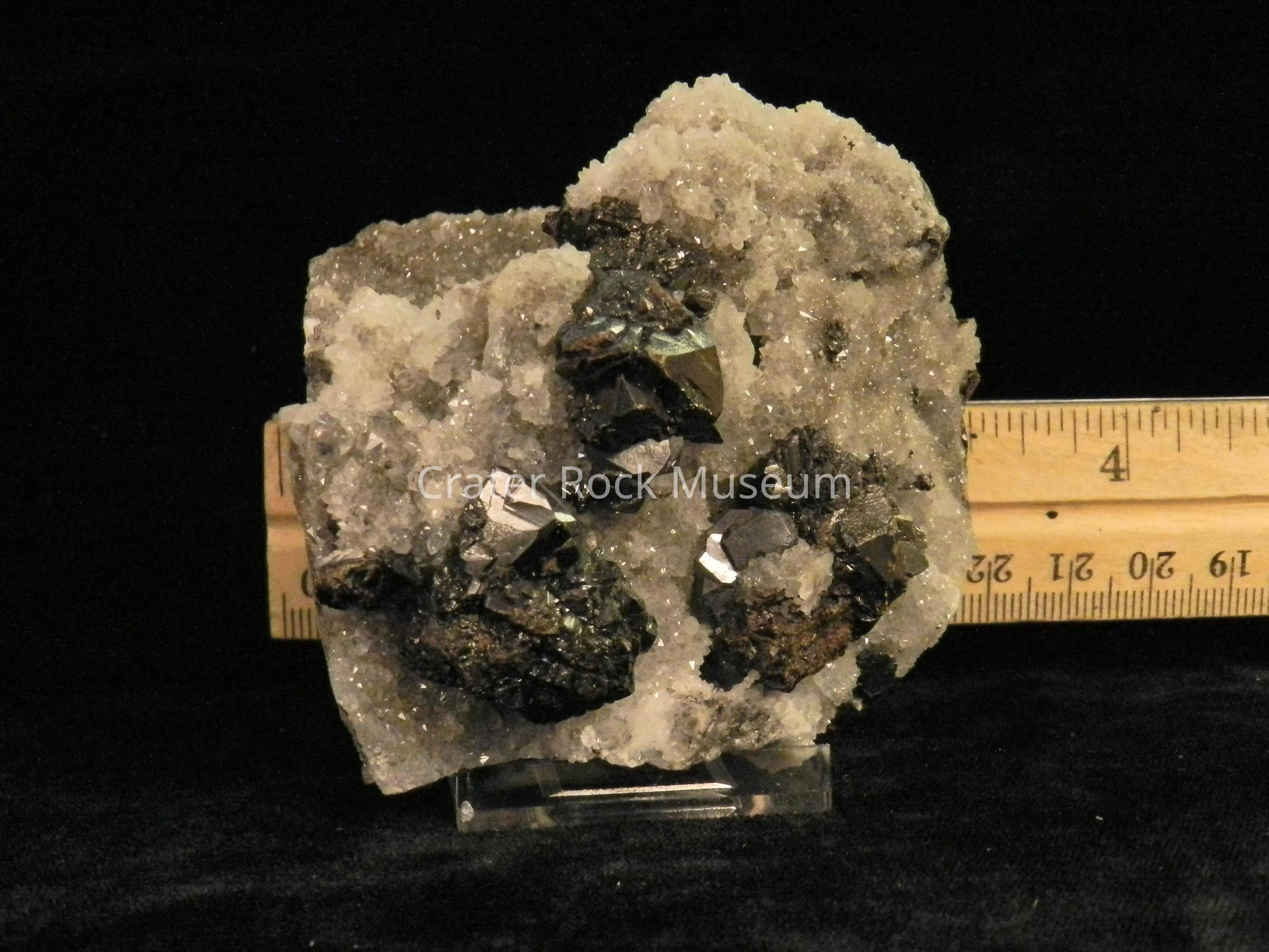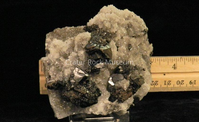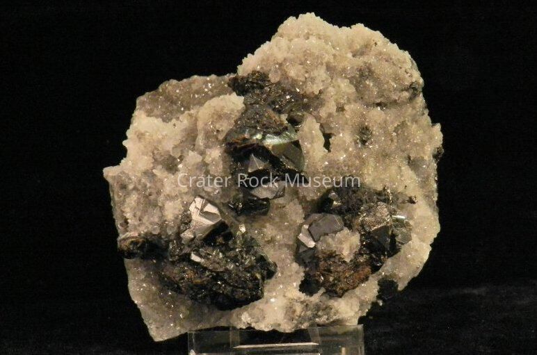 Description: Small dark gray crystals protruding from opaque white to light gray crystalline base.