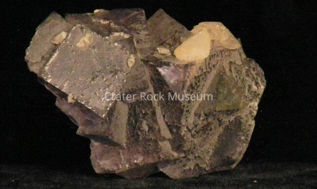 Description: Purple fluorite mass of rectangular crystals, with occasional white to off-white calcite crystals embedded on surface.
