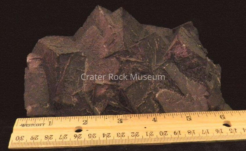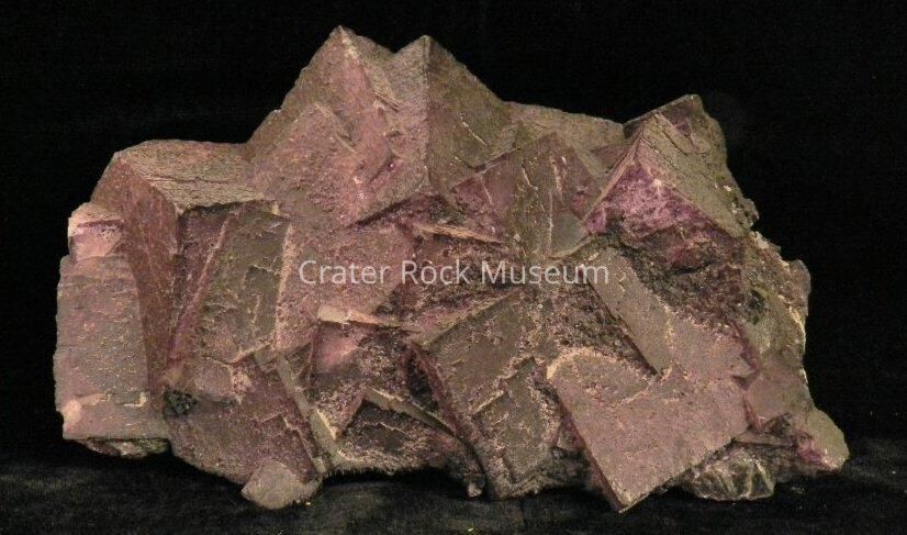 Description: Dark purple crystal cluster (large-sized, 'chunky' crystals). Delmar: "Very translucent with well-formed cubes 1 -3/4 to 2 inches on a side, interpenetrating one another, with small cubic 'outlines' on the crystal faces."