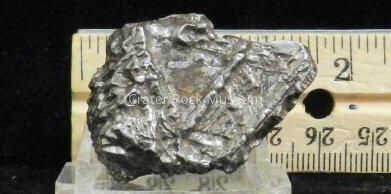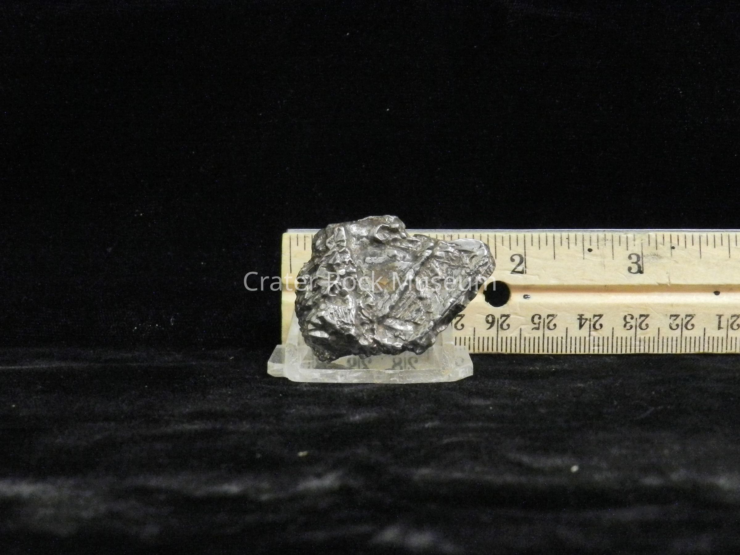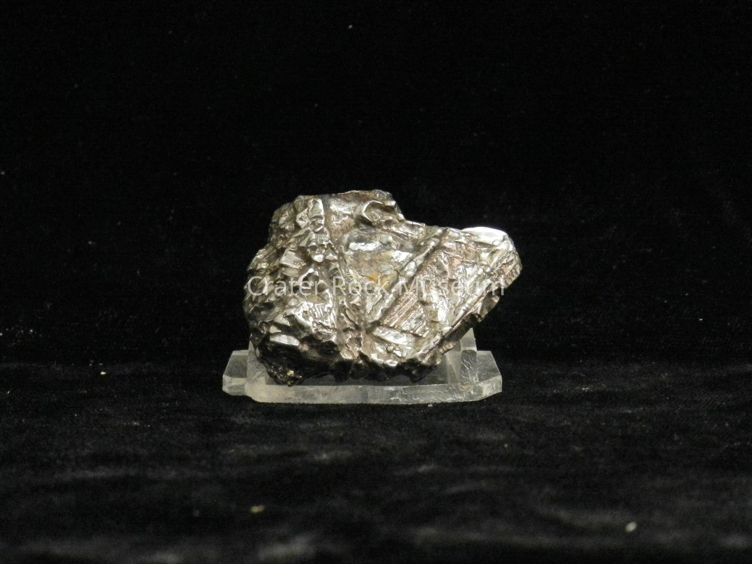 Description: Very silvery, metallic 'look' due to coating. Internal crystaline structure very prominent. In Feb 2012, this specimen was identified by Dick Pugh, PhD, of the Portland Meteor Lab as being a Nantan with de-rust treatment and protective coating.