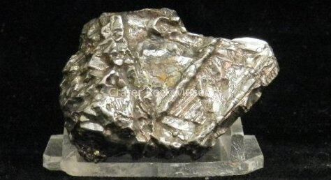 The Nantan meteorite fall was witnessed in May of the year 1516 during the reign of the Chinese Emperor Zhengde. Most of the Nantans that are seen are heavily rusted. The Museum's specimen was coated with a "protective" coat to keep it from falling apart, prior to accession. If you were to pick up some of these very rusty Nantans they would feel much lighter than would be expected for an iron meteorite. This is because a large portion of the meteorite is composed of iron oxide (rust) and not iron! By contrast, this piece comes from the core of a large meteorite, where there is no rust. These core pieces are very heavy, as you would expect an iron meteorite to be, and they are stable. They also show the internal crystaline structure of the Nantan meteorite without having to cut and etch them. Nantans are composed of approximately 89% iron, 6.8% nickel and trace amounts of a variety of rare elements.