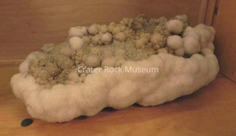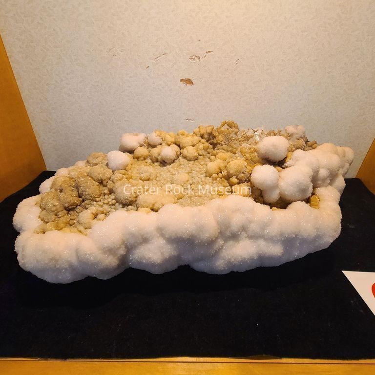 Description: Near-white, botryoidal-form, druzy quartz crystals partially surround a central mass that has a dull-brown druzy surface. Latter surface also contains some clear quartz crystals.Collection
