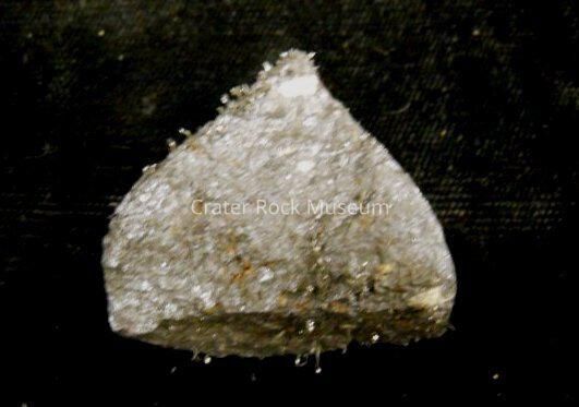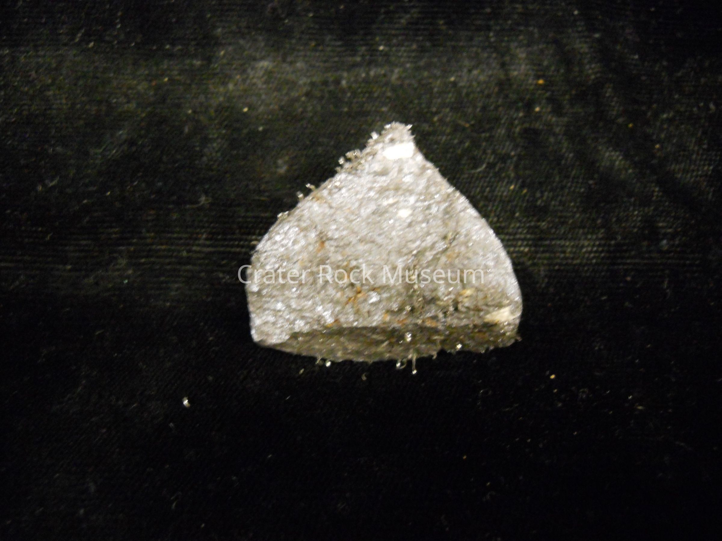 Description: Semi-triangular piece of magnetite. Silver-gray coloring. ("Beads" are iron scraps attracted to specimen.)
