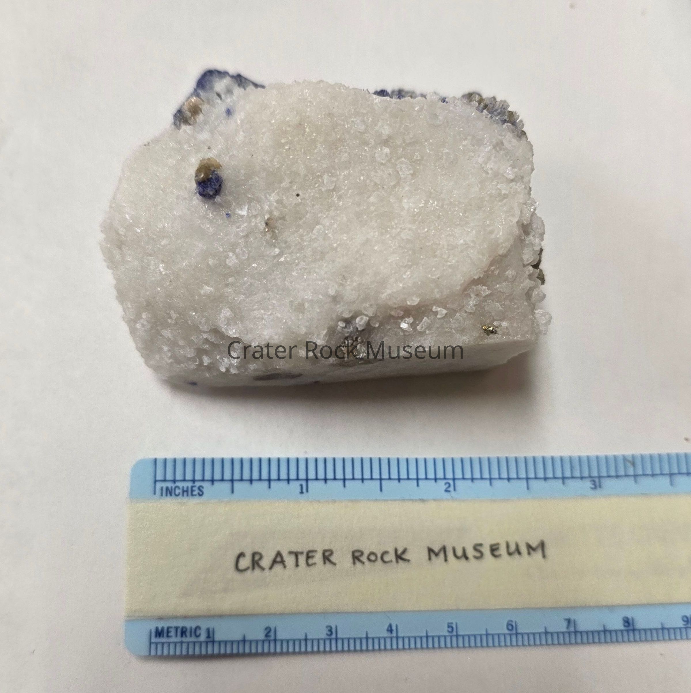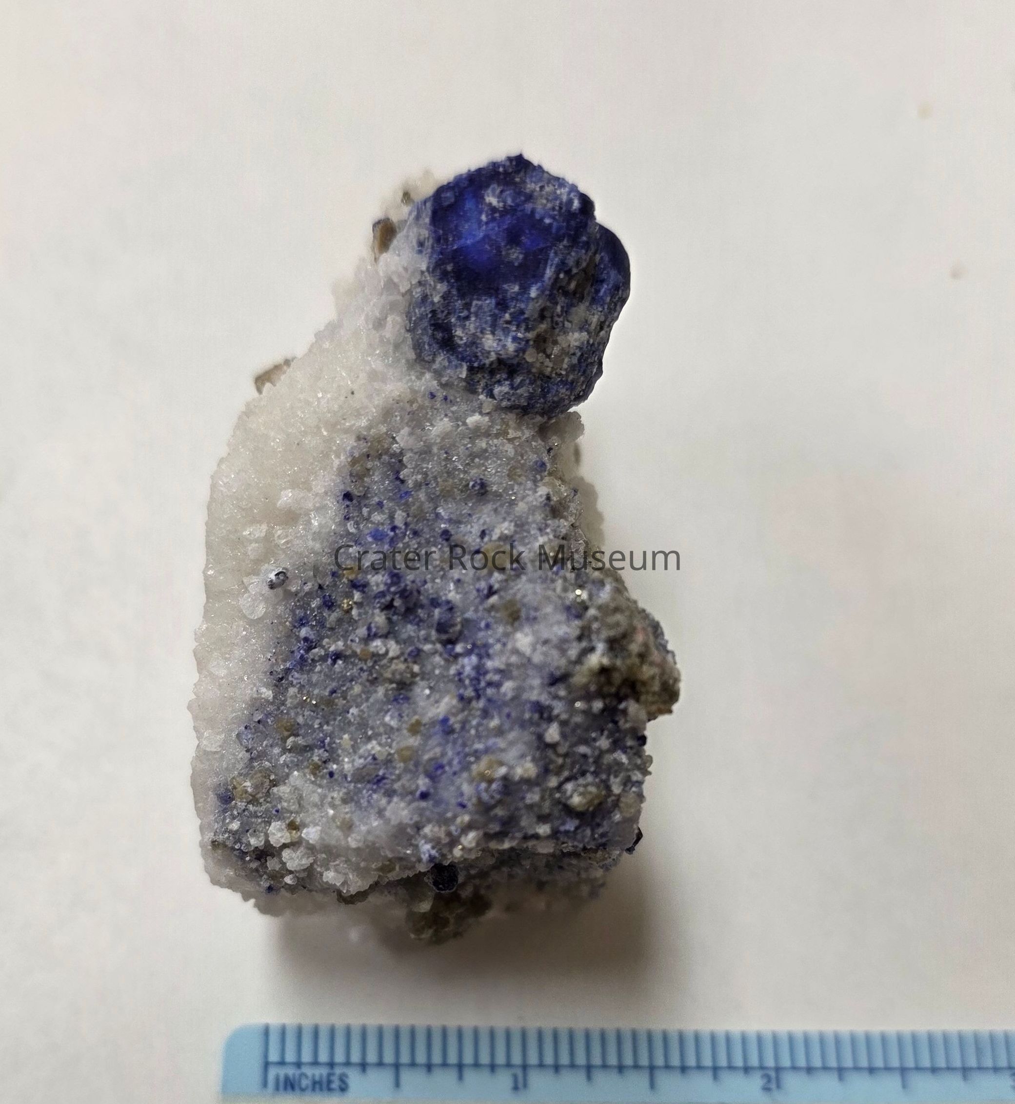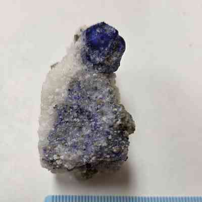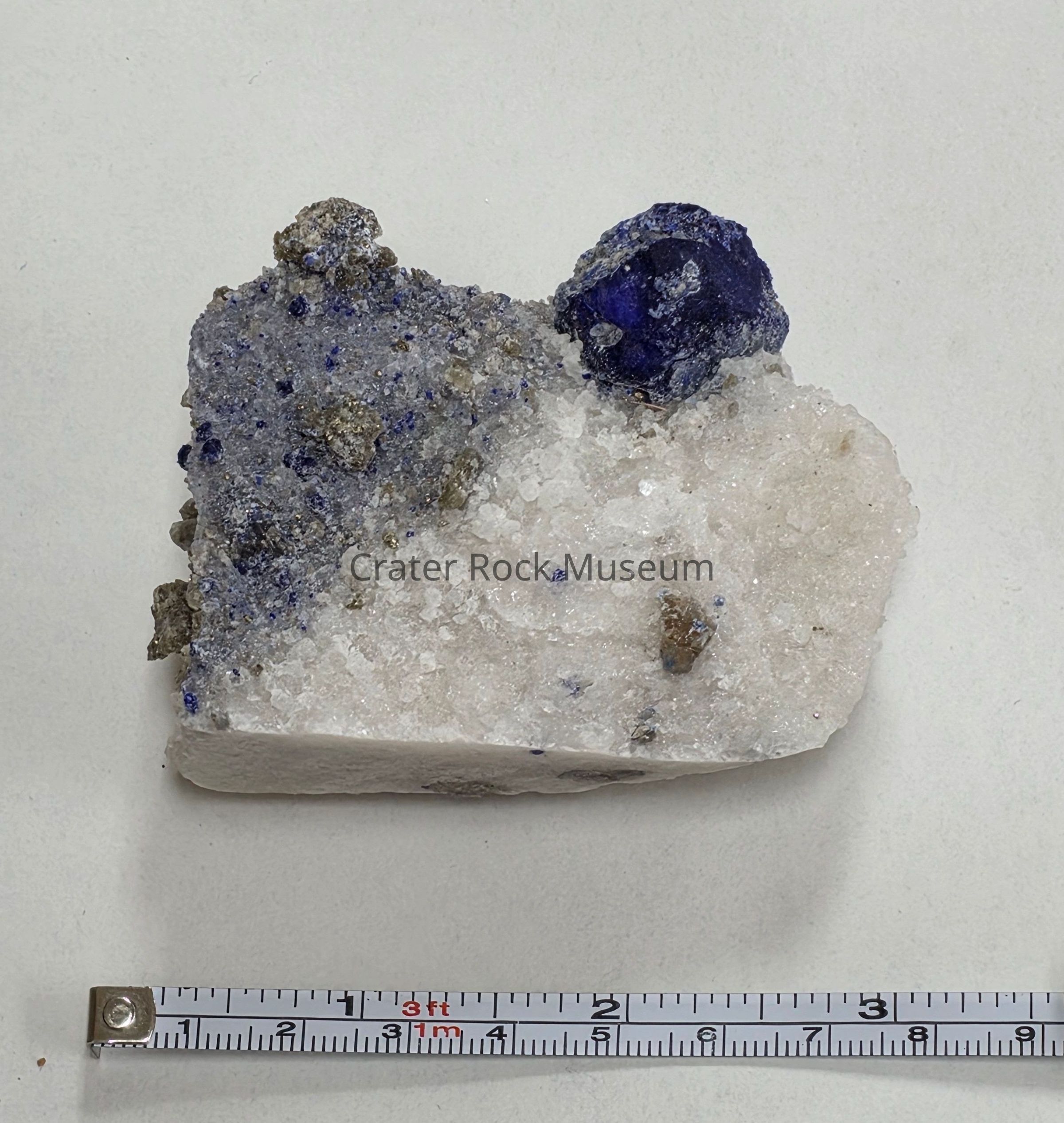 One large deep blue polyhedral crystal atop a drusy white matrix freeform. Some smaller blue and pyrite crystals throughout one side. For more info, see https://www.mindat.org/min-2357.html