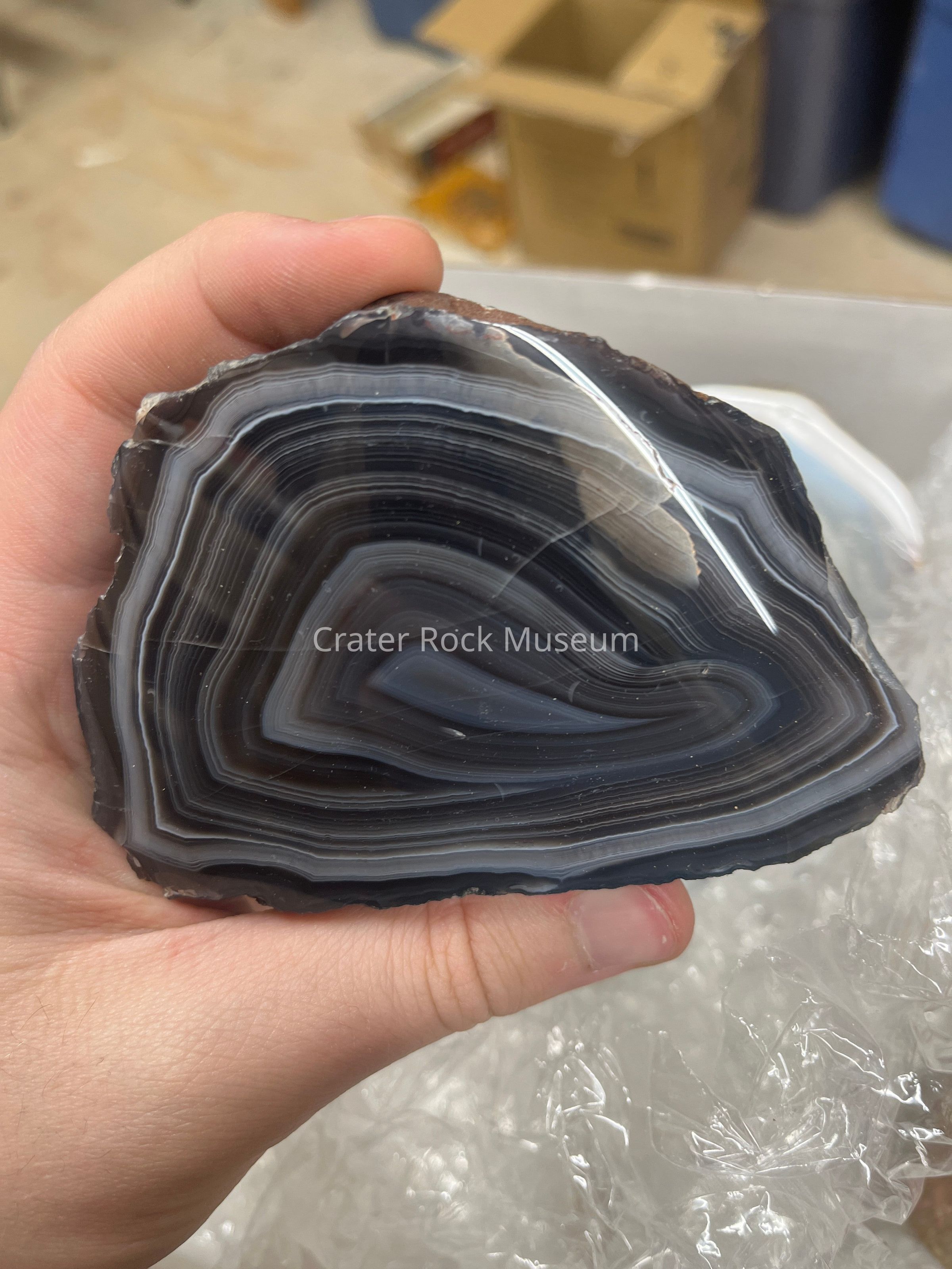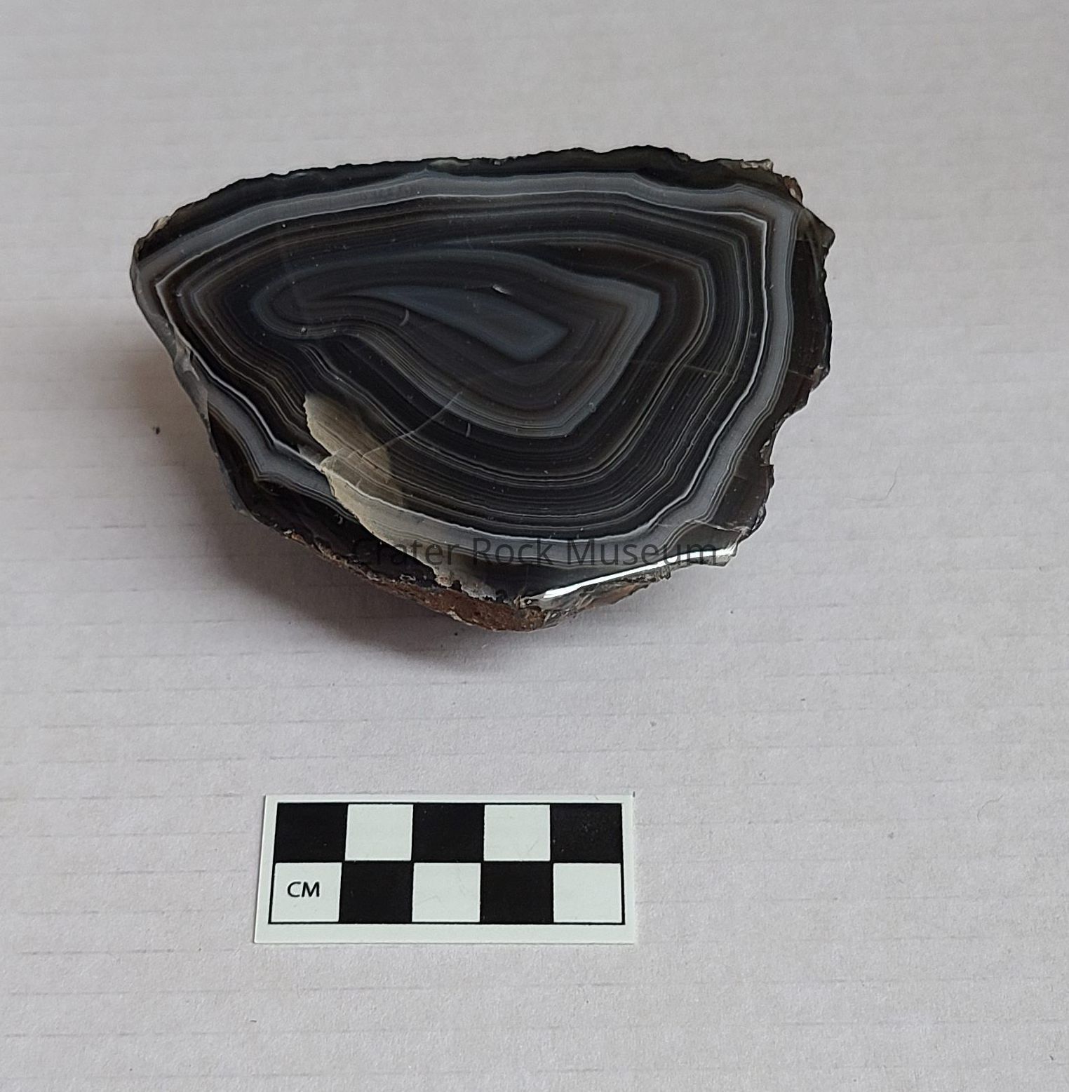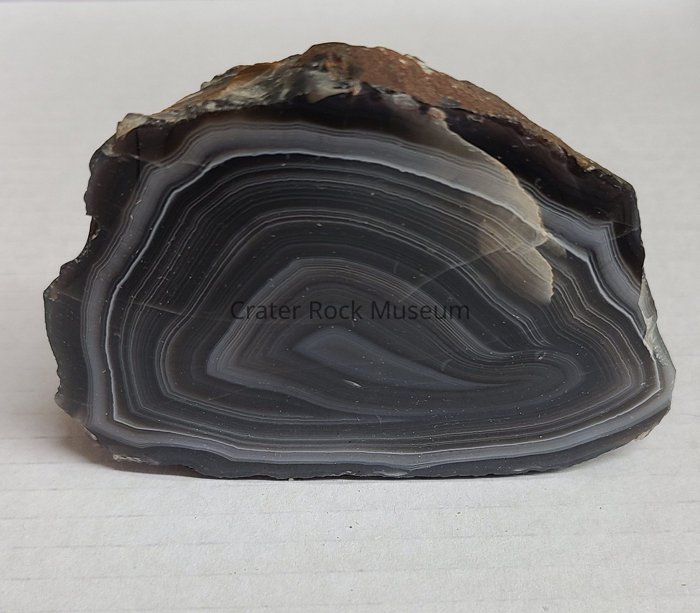 An Agate Nodule from Botswana, South Africa. Polished side shows fortification bands in Dark Blue shades. A Beige blotch enters from outer edge not reaching center. Nodule's outer edge is Dark Blue with Reddish coating. Two surface cracks run through center.Dimensions