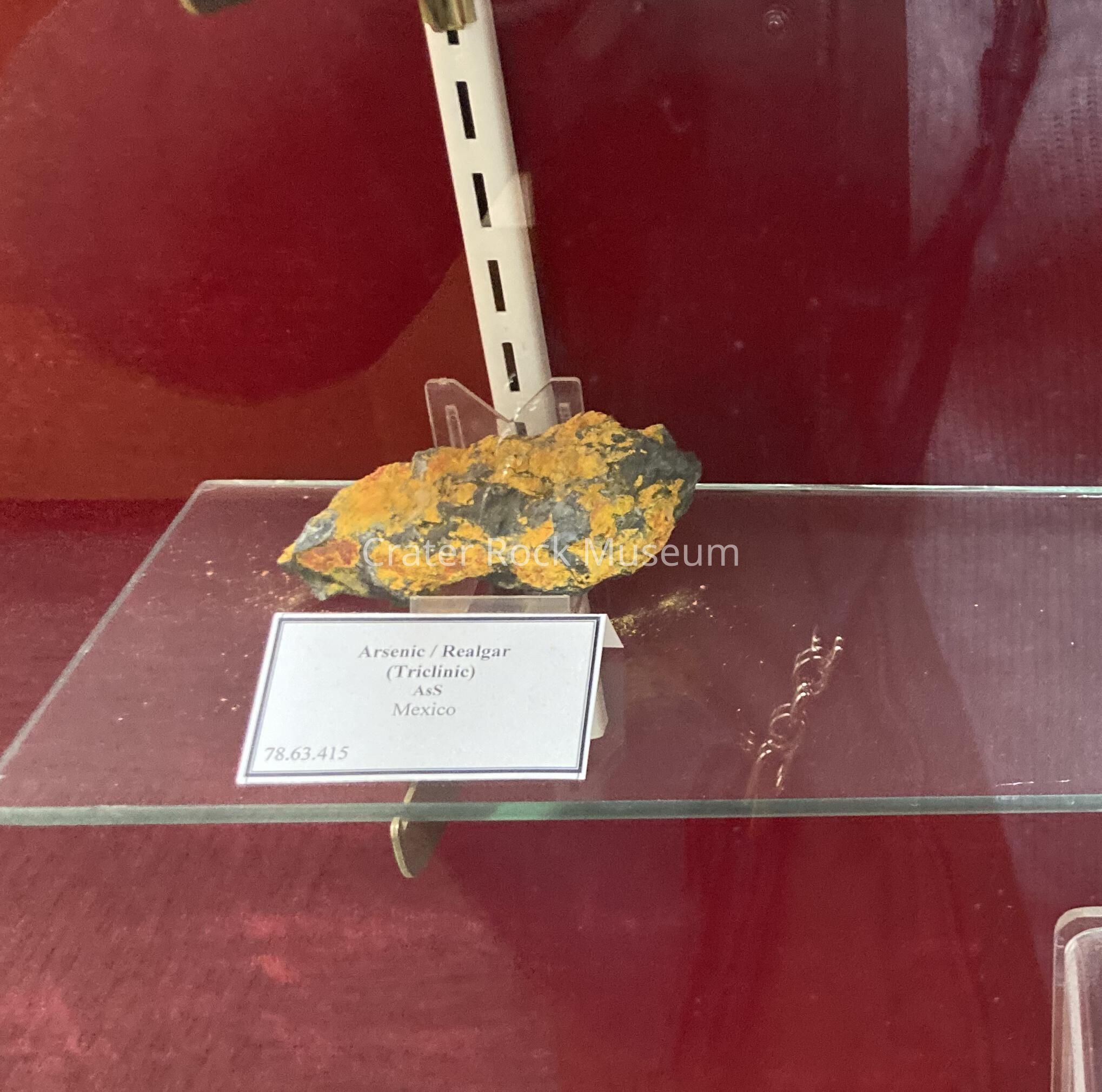 Description: Delmar described this specimen as one, "Realgar or Arsenic Sulfide crystals, orange-red on dark grey matrix rock. It is an iron type and it's what they make arseniic out of.
