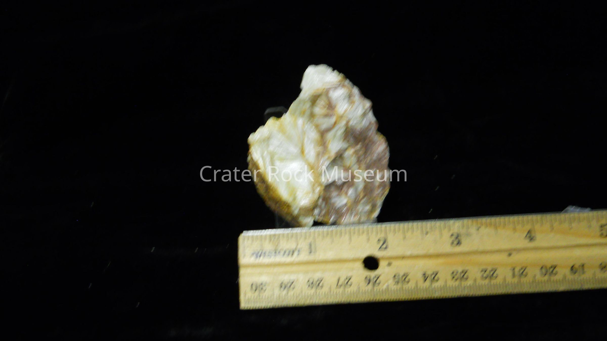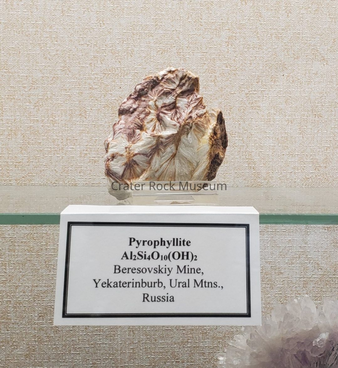 Description: Delmar described this specimen as one, , pyrophyillite crystals, white, with yellow to reddish stains. Crystals are kind of a star formation. Rock guide calls them radiating bundles of small crystals.
