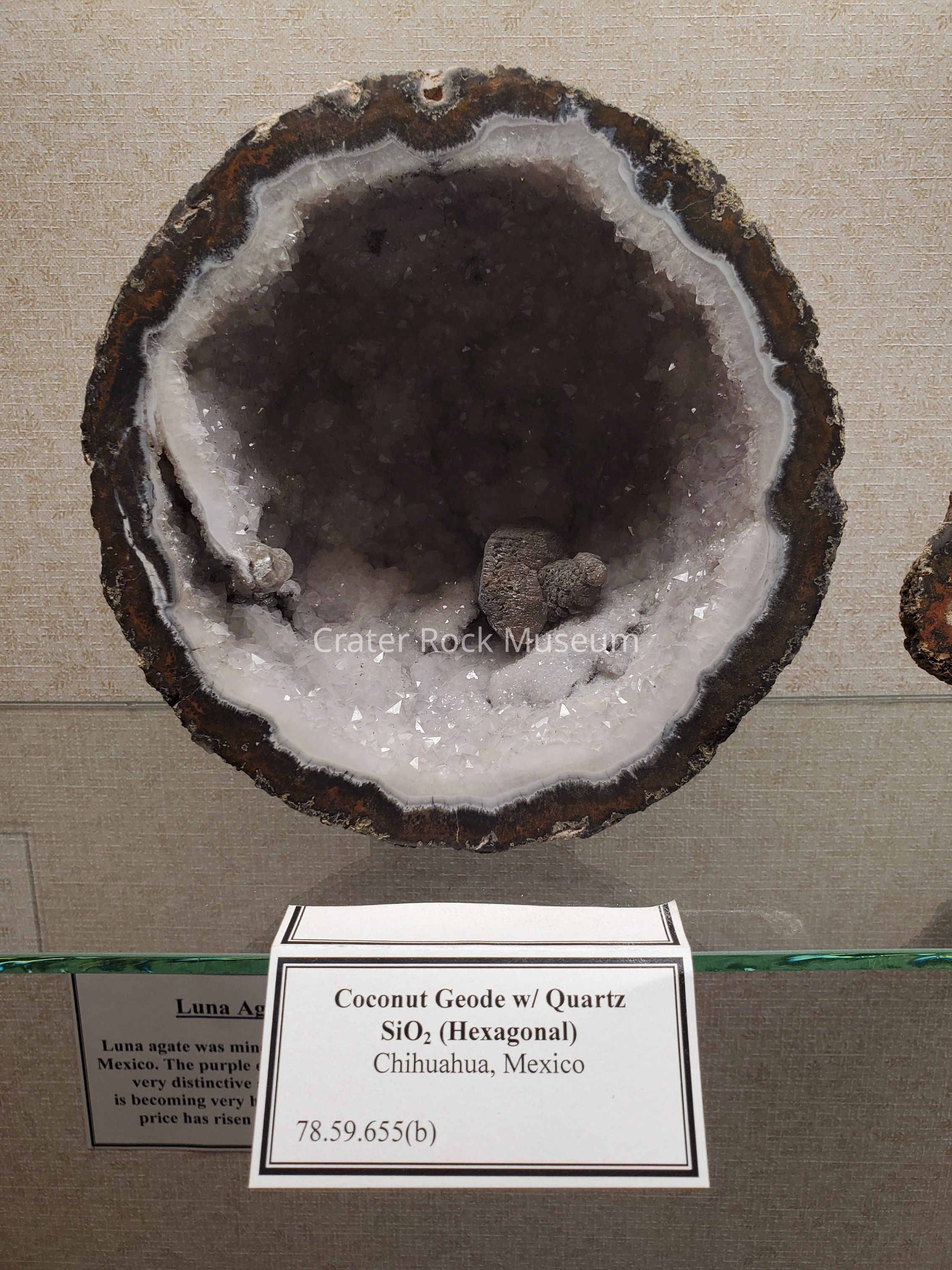 Description: (Delmar) Agate geode (one of fourteen originally accessioned under this number). Cut side shows amethyst-colored drusy quartz crystalline lines. Shows calcite crystals in browns and clear. Surrounding rock is in fortified agate in white and blue grays, and brown and gray rock. These type of geodes are referred to as 'coconuts'.