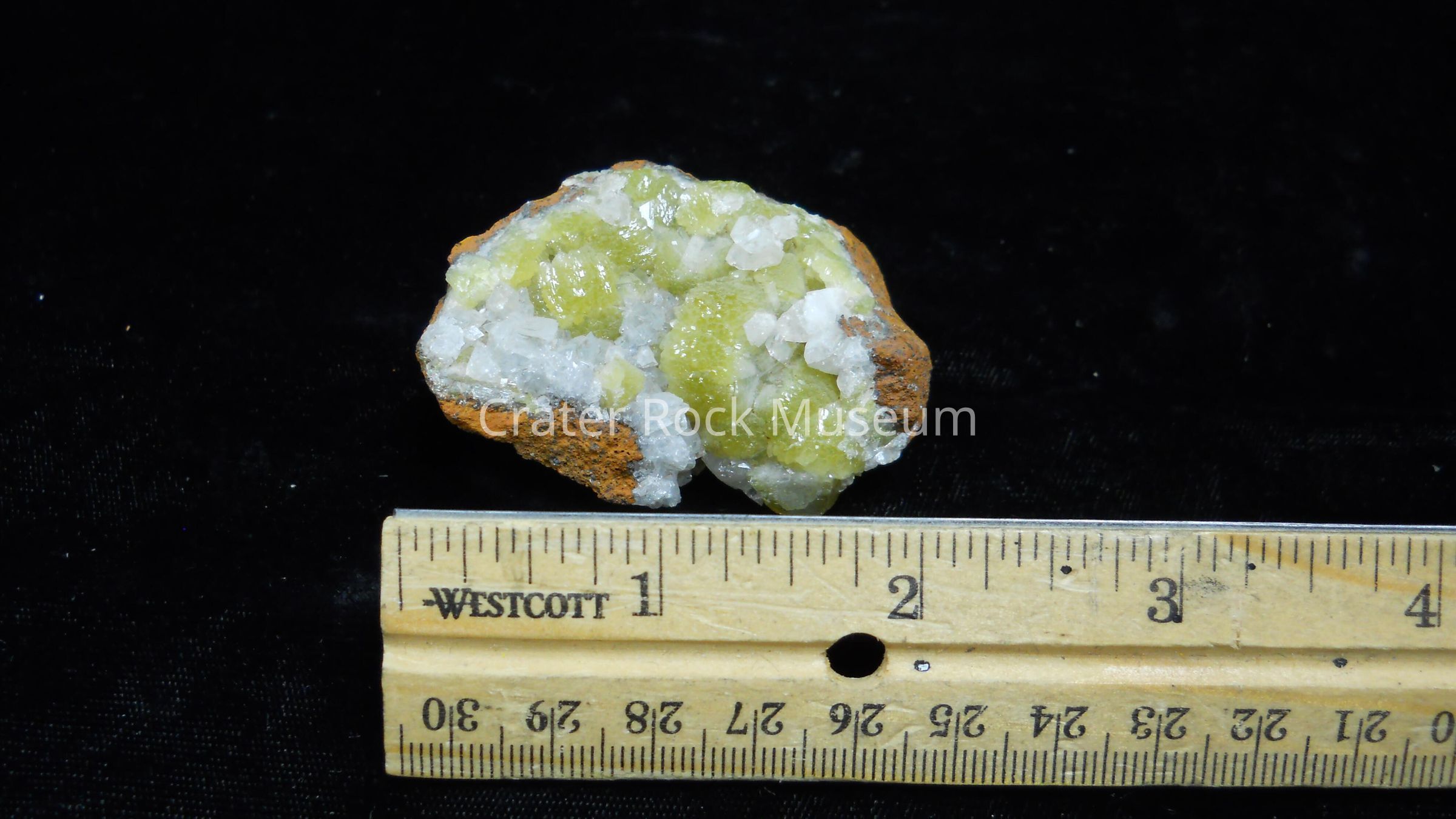 Description: Small specimen with a reddish-brown matrix and a green and white crystal structure.