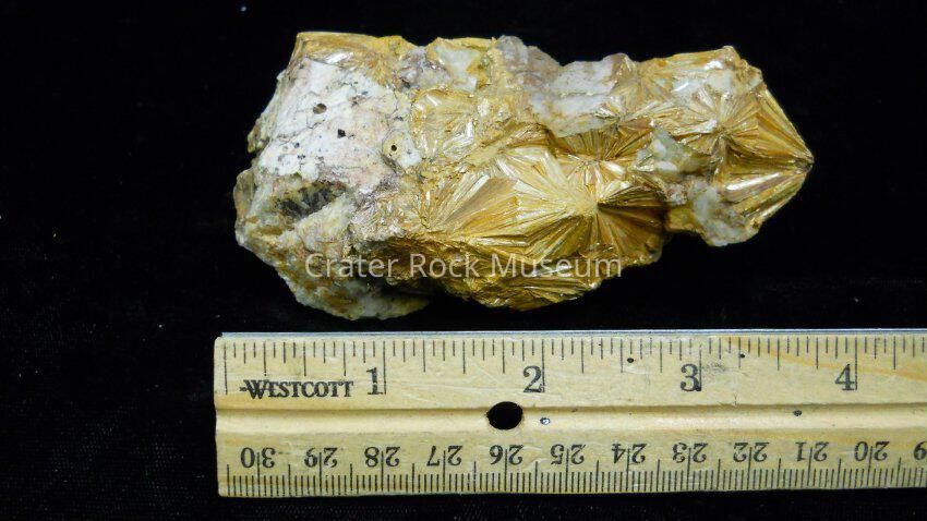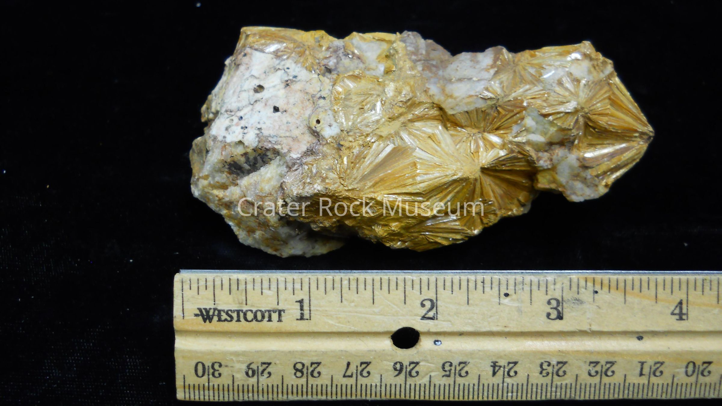 Description: This specimen has multiple "leaf-like" structures with sprayed centers and a pearly consistancy. Color is a dark tan.