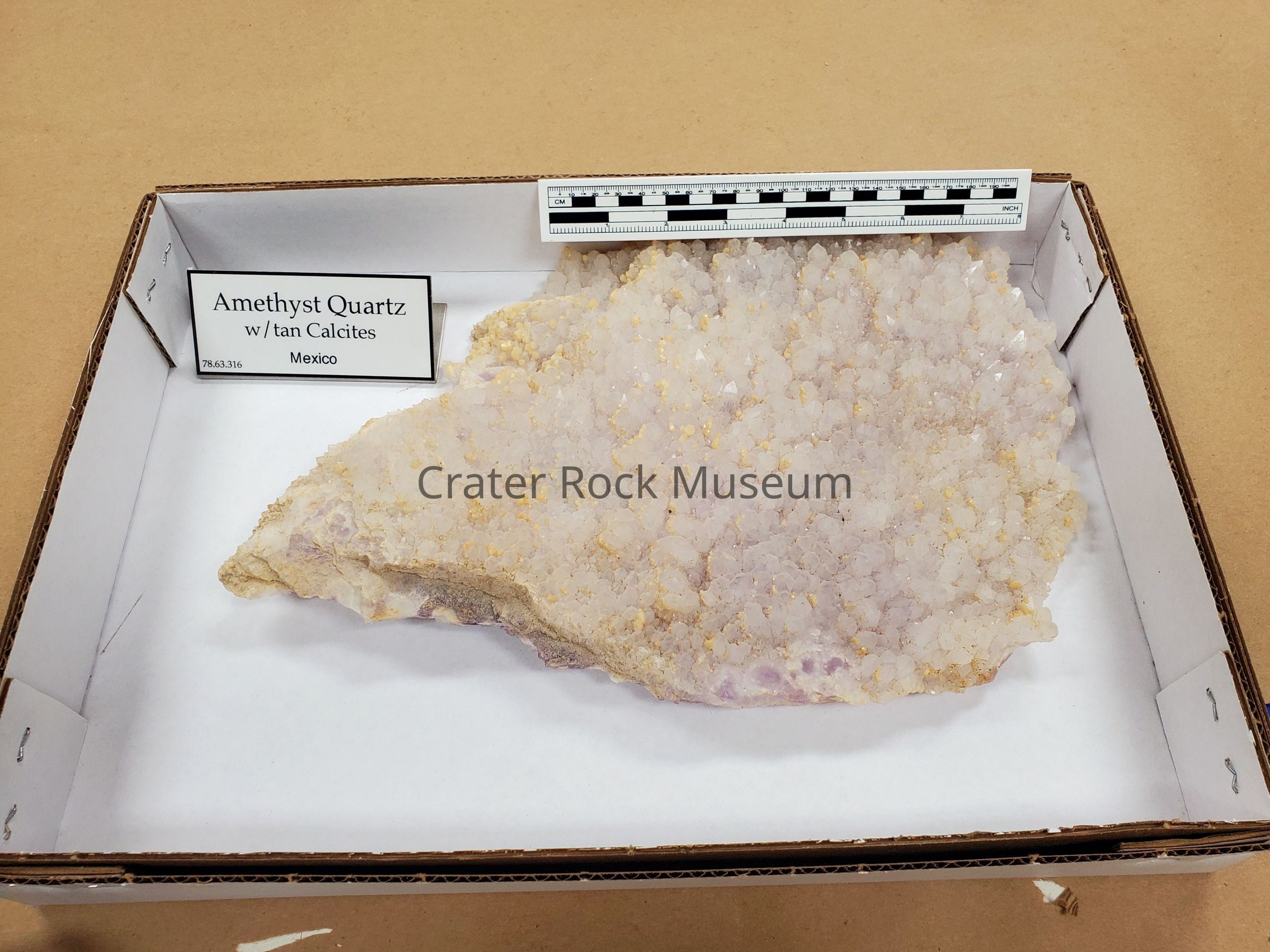 Topped with protruding white and faint Amethyst crystals with tan crystals (possibly calcite)Collection