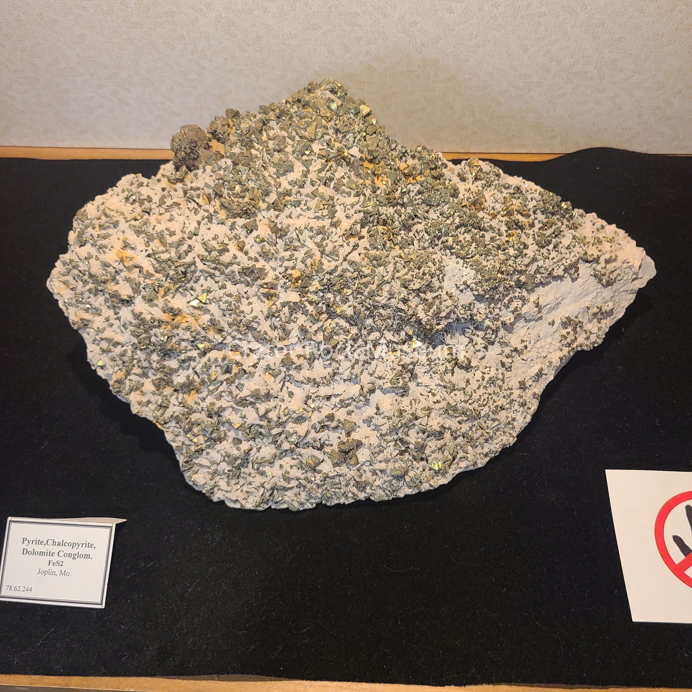 Description: (Delmar) This piece of ore is from Joplin, Missouri. It is a mix of Pyrite, Dolomite, Chalcopyrite, Copper and Lead on a Chert base. Colors: Grey and white Chert with some ochre stains, pink Dolomite, metallic gold Pyrite, metallic Chalcopyrite with rainbow sheen, some green copper and grey lead.Collection