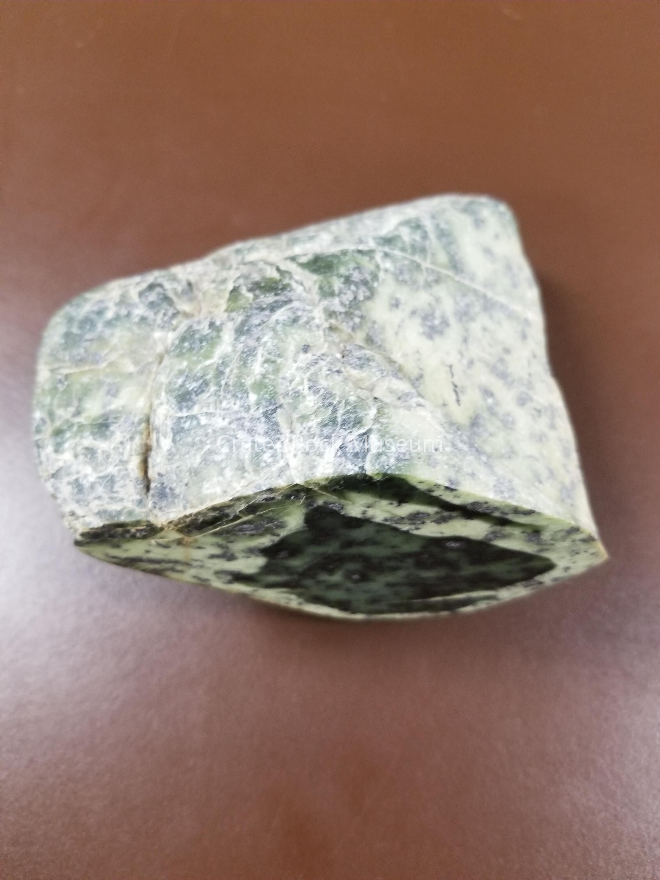 Halved and polished Applegate Jade (Serpentine). Work done in RAGMS Workshop by Gary Yeoman.