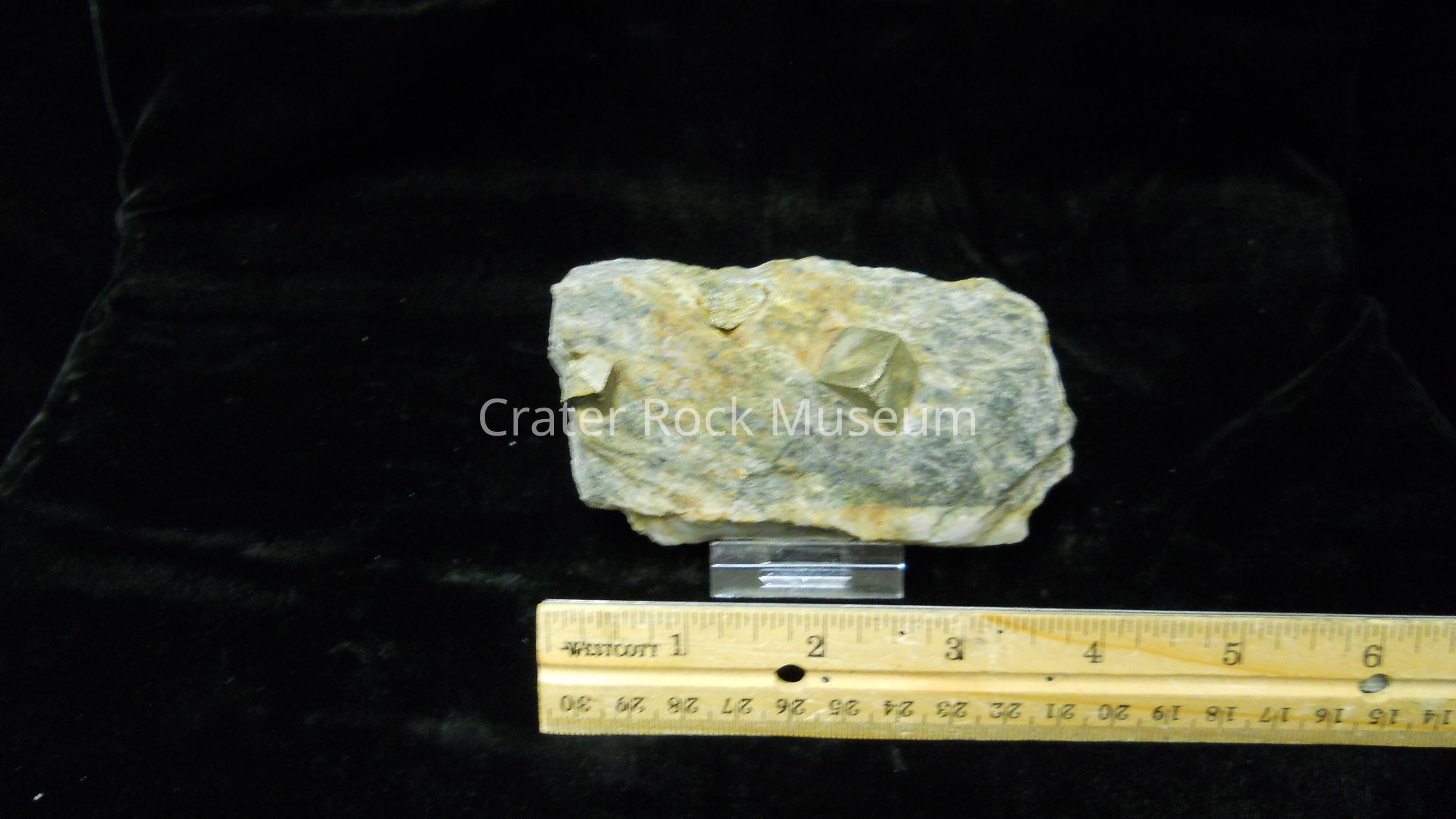 Description: Three gold colored cubes of Pyrite 1/2" large per side sticking out of a layered,grayish, earthy rock. White Quartz vein runs down one side. These cubes of Pyrite frequently alter to Limonite,which stillremains the cubic shape (Pseudomorph).