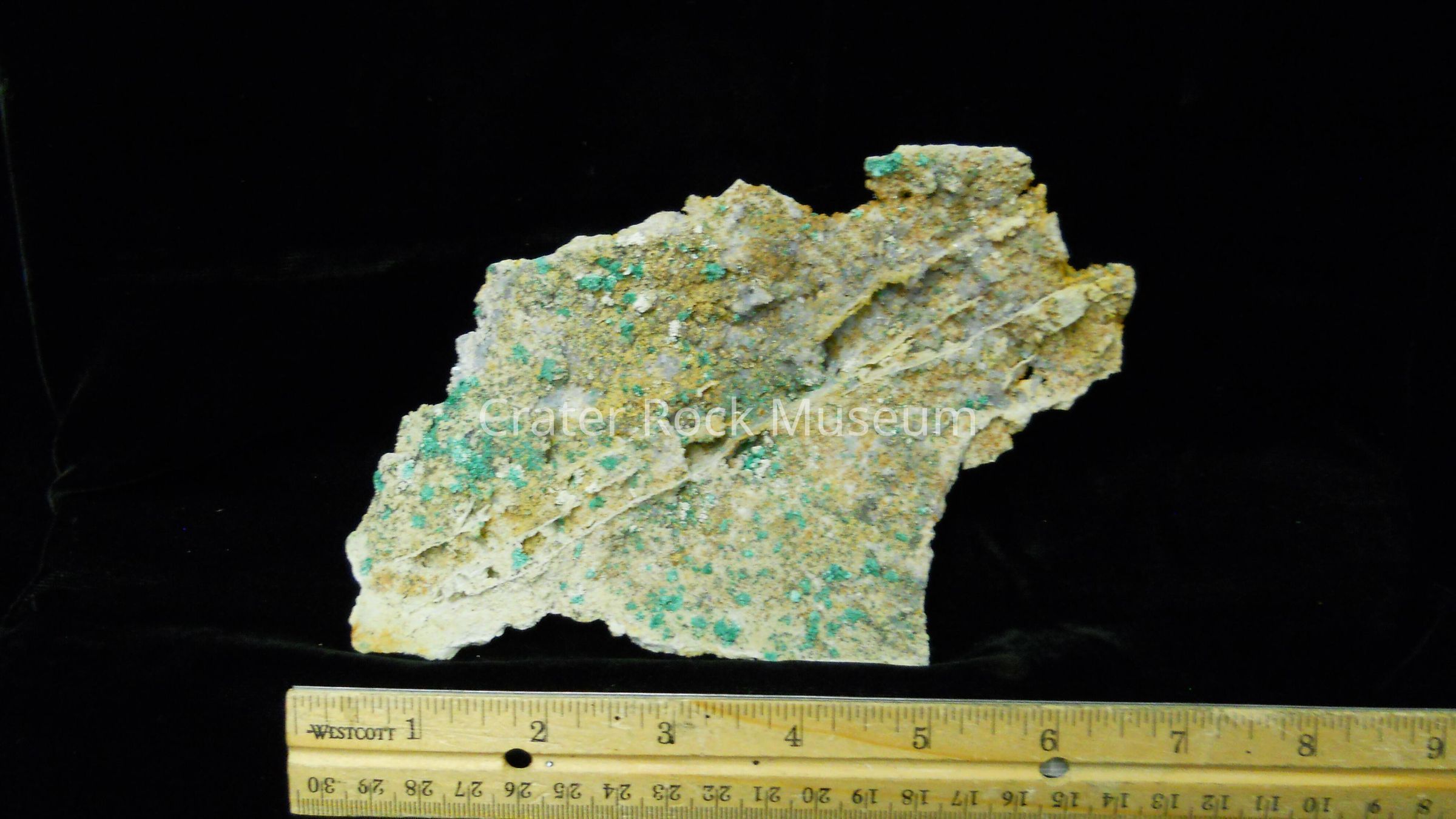Fluorite and Malachite. Colors: white Chert with orange and yellow stain, small deposits of Malachite on pale grey Fluorite crystals.