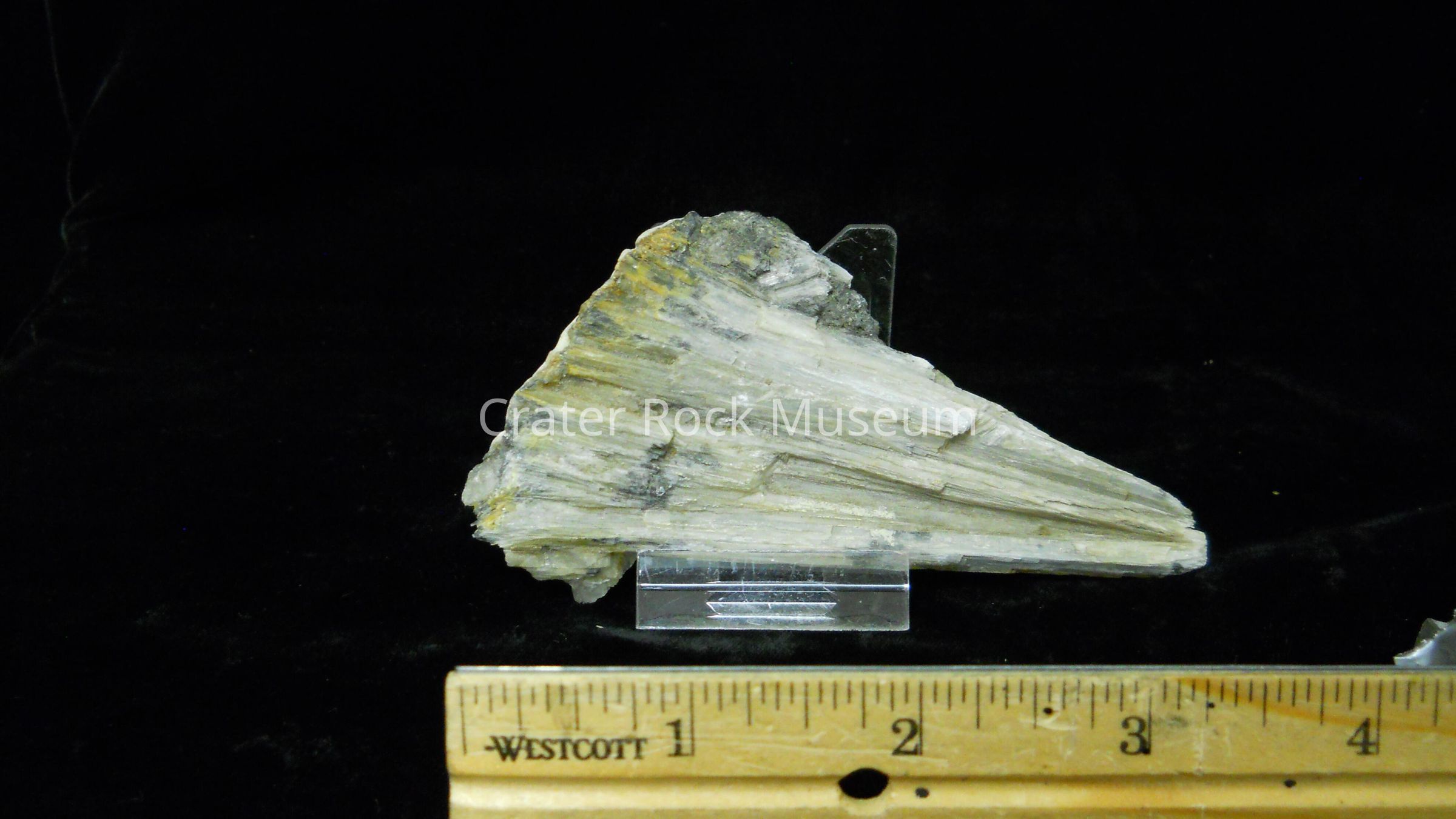 Description: Zeolite crystals and lava. Triangular or sheath shaped piece that is dark and light grey on greyish lava.