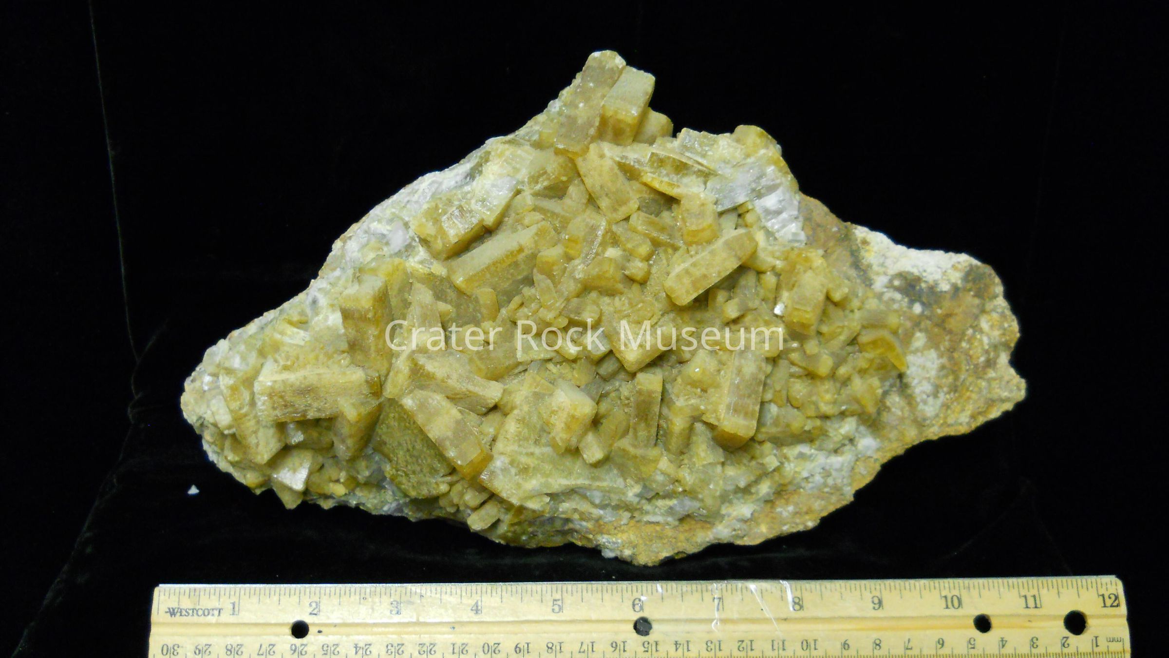 Description: This specimen has beautiful ,large crystals on its top surface that are an opaque, honey color. The base is most likely an iron ore. Several patches of small, clear crystals are also visible,top and bottom.Collection
