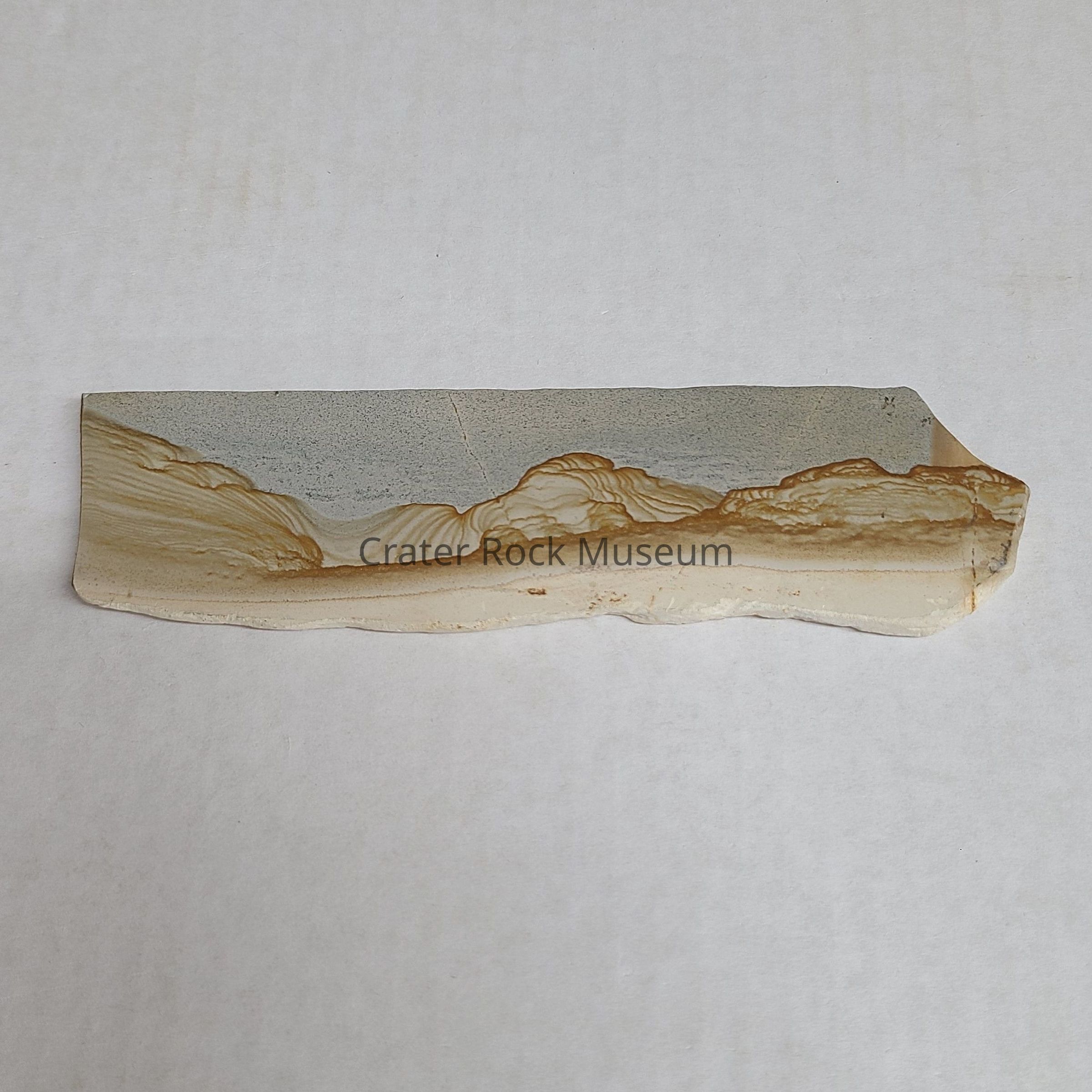 Description: Thin slab with polished face, white to tan sedimentary stone on bottom, burnt red on upper half with speckled gray similar to hilly desert landscape.Collection