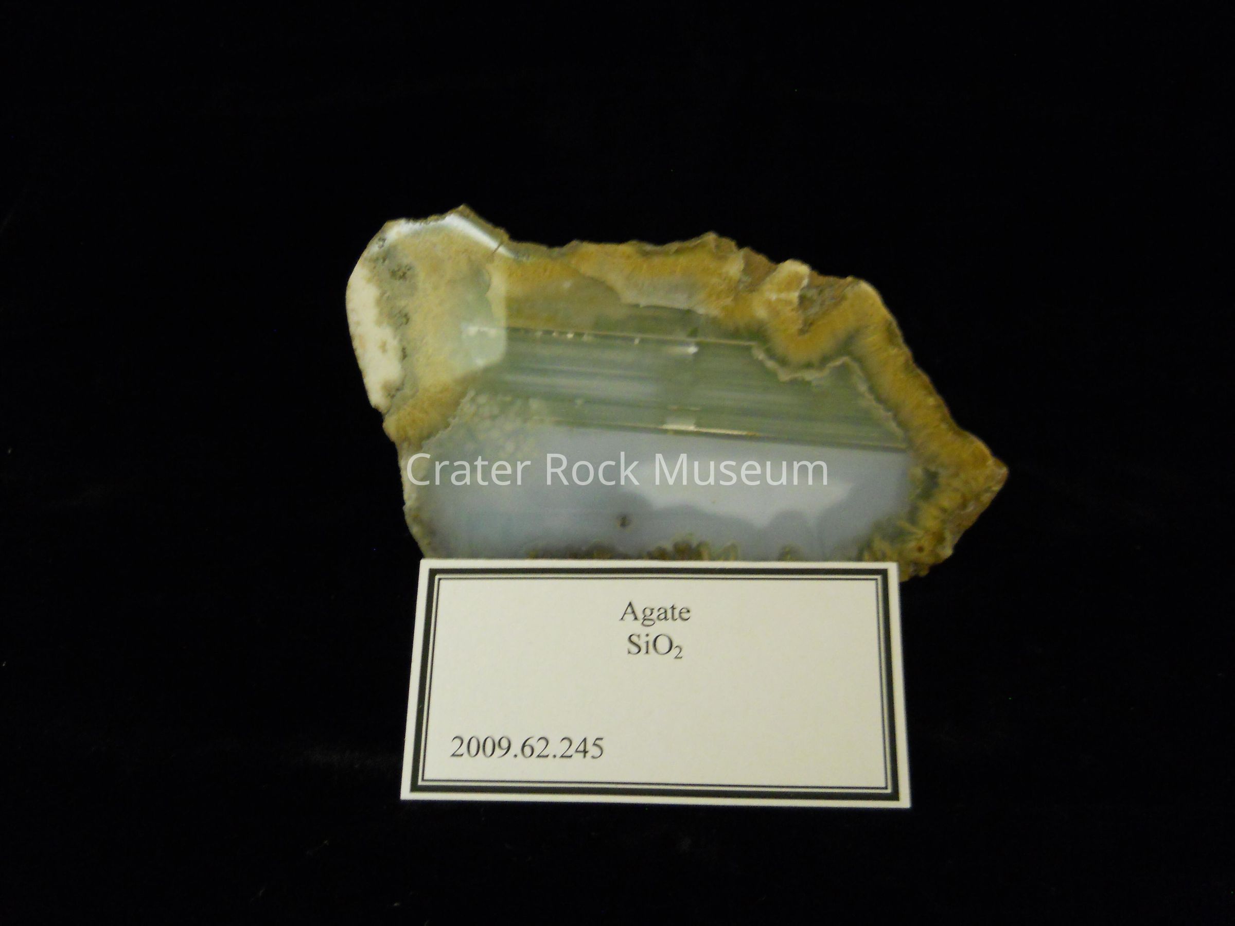 Description: Thin slab with polished face. Light green, horizontal striations (water), light blue (sky), with a white center (cloud) , surrounded by a tan, brown, and black mineral on outer edges.