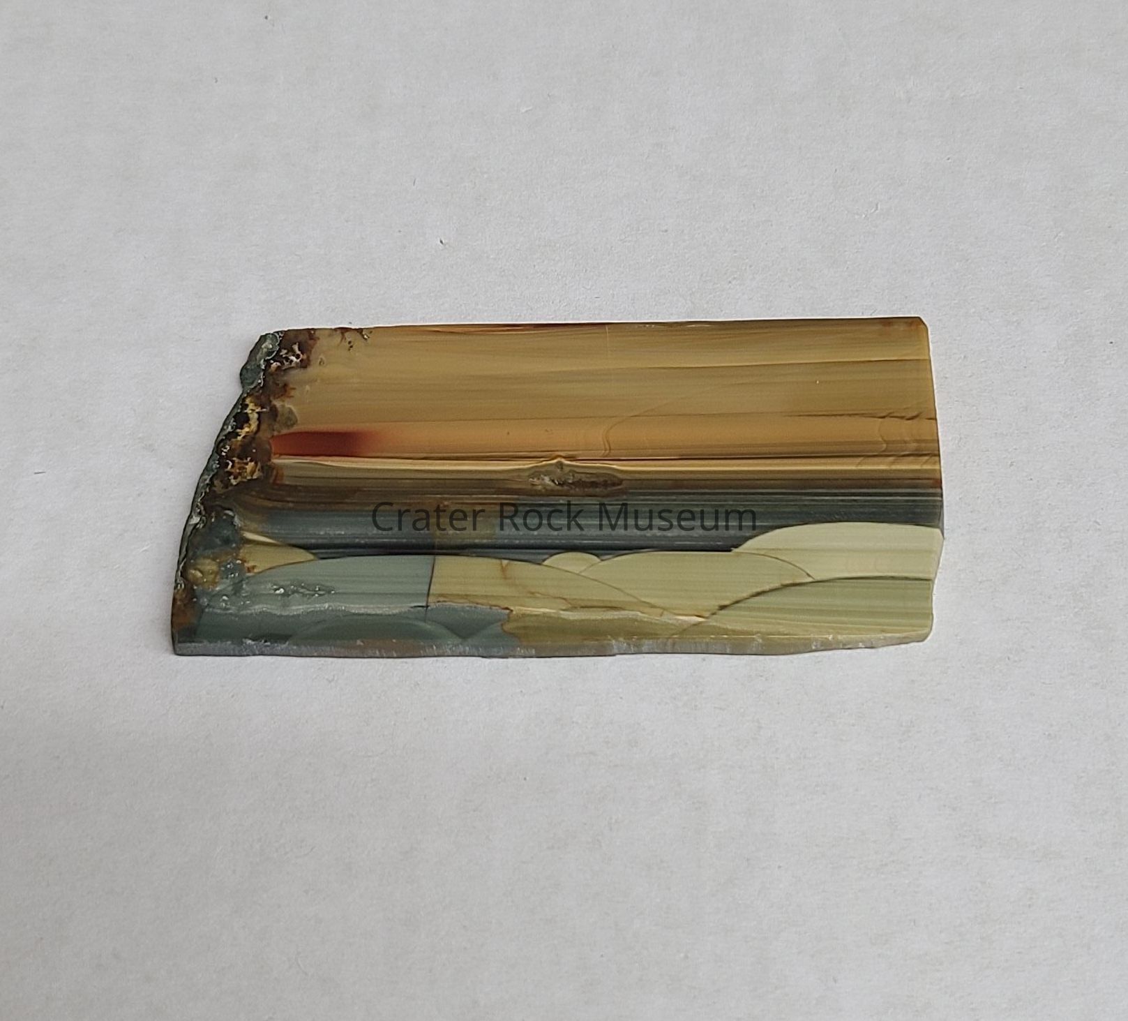 Description: Thin polished slab, with multi-colored layers from white to light blue (shore), blue striations (water), yellow (sky) and red (sunset).Collection