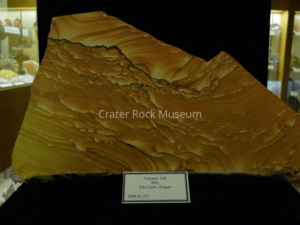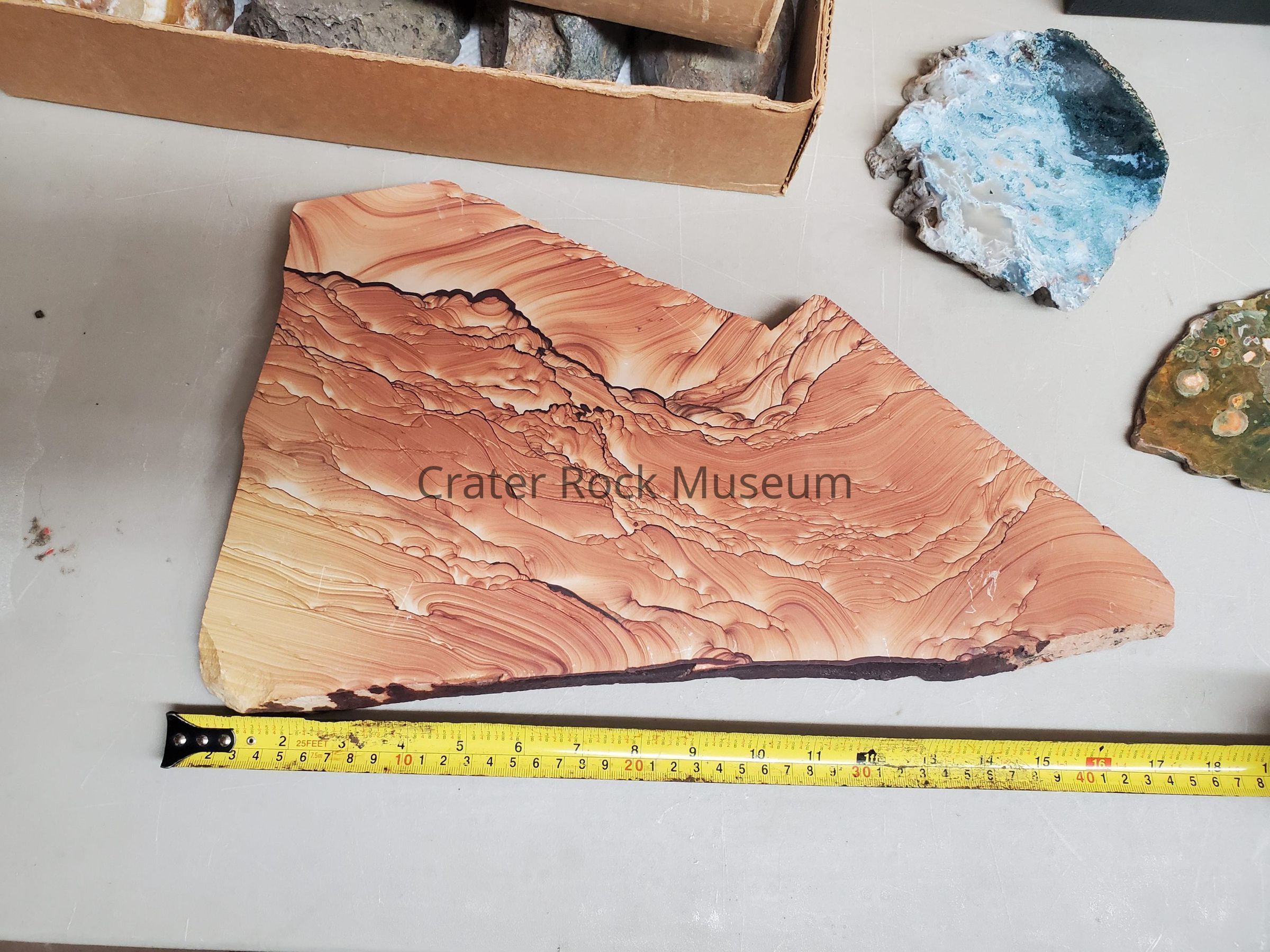 Description: Thick polished slab with banded, rolling striations, white to burnt orange (foreground) with more linear striations also white to burnt orange (small area of background).