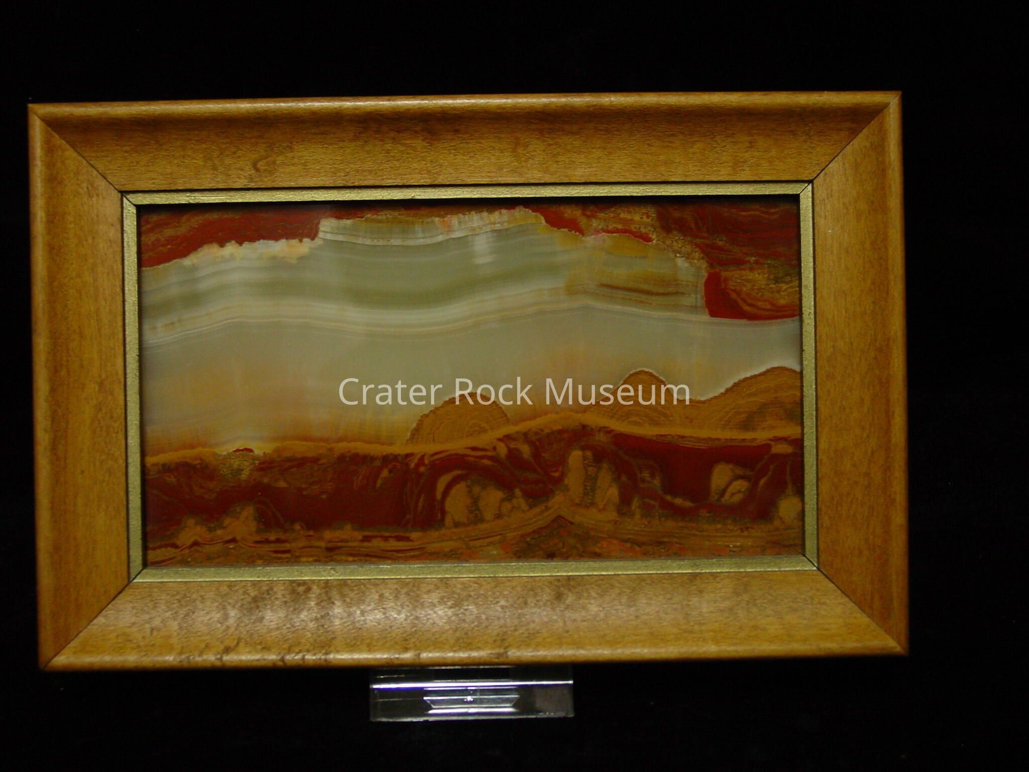 Description: Thin polished slab (in picture frame) with dark tan to burgundy layers with rounded intrusions (foreground) and dull white to light blue banding (sky) and a burgundy top layer (above sky).Collection