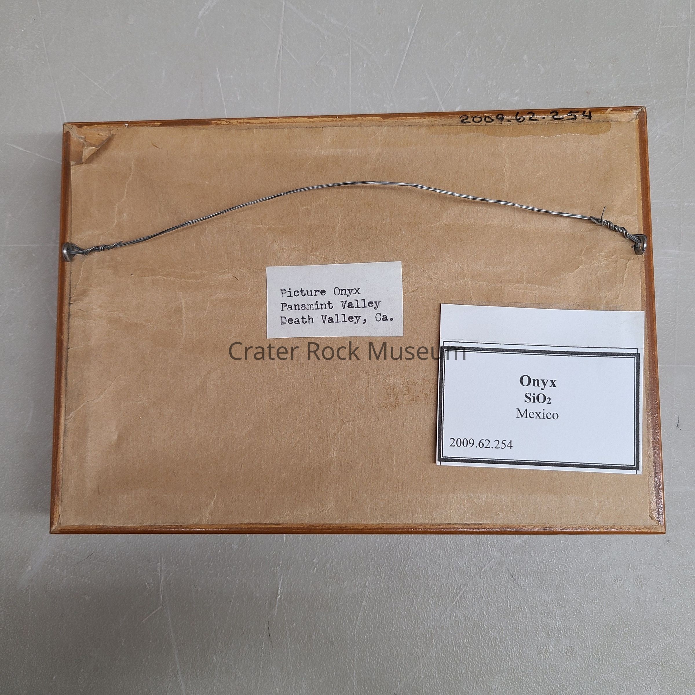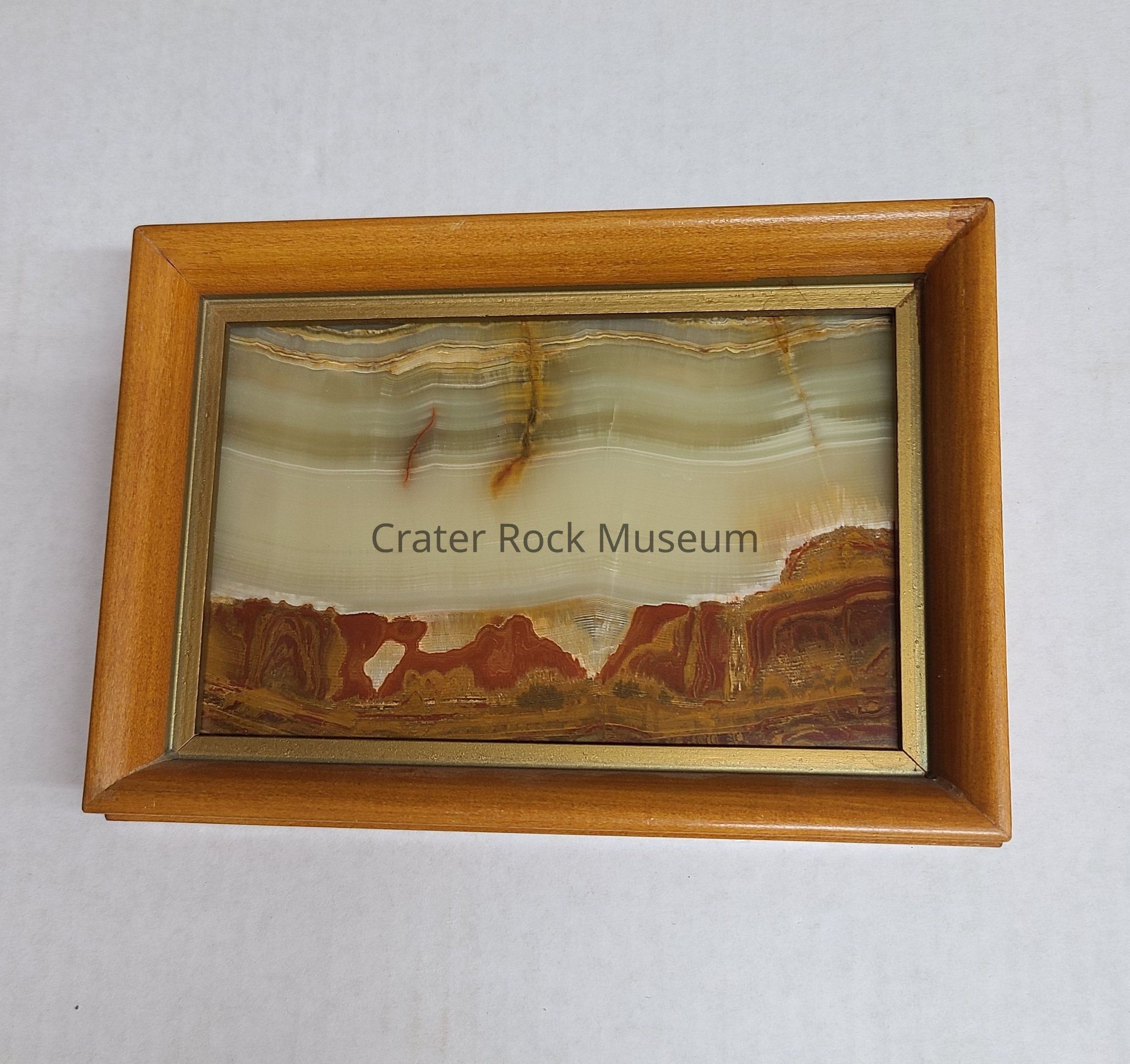 Description: Thin polished slab (in picture frame) with light brown, dark green irregular layers (foreground, mountains), creamy light green with banded darker green (sky) with a couple of reddish-orange vertical streaks intruding through the green (sky).Acquisition