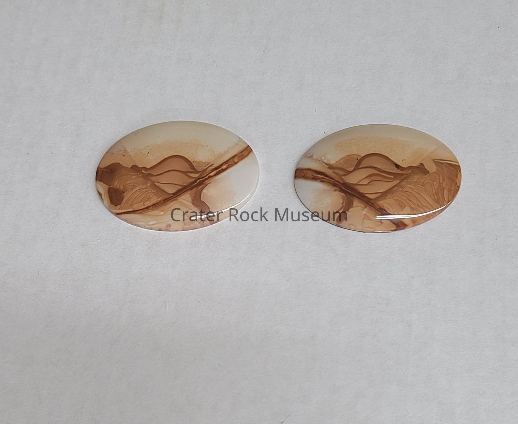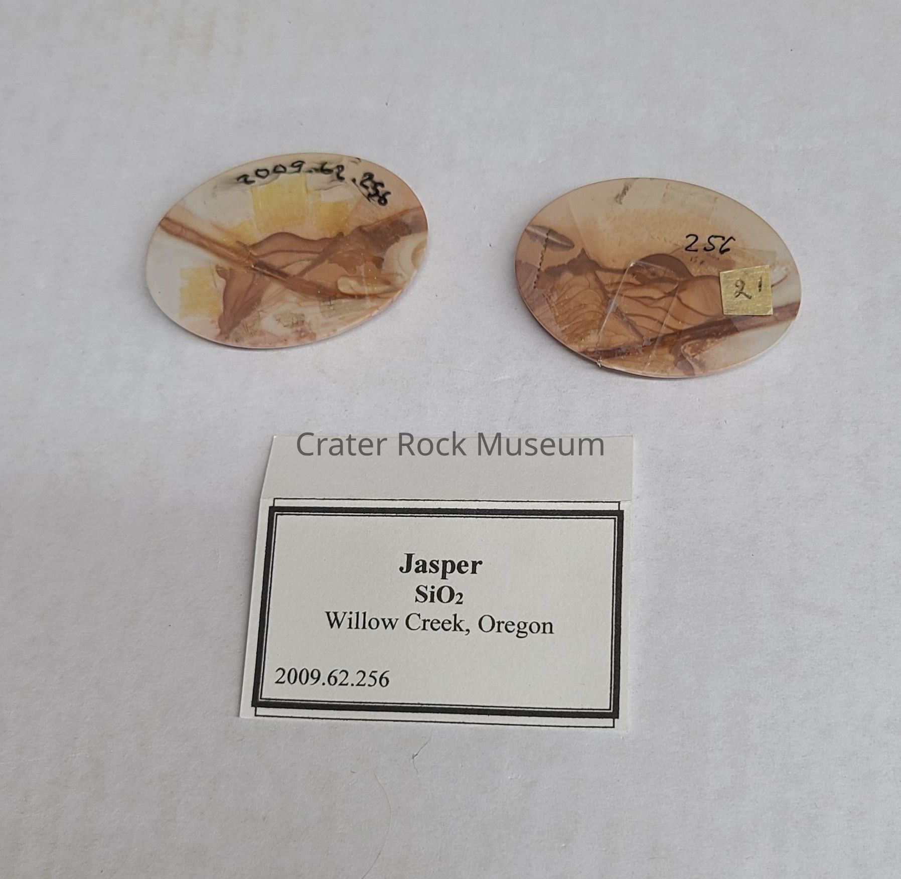 Description: Thin polished slab (oval), with polished face. Light to dark brown with a red streak running through the entire face, and the upper half has a light red to cream color.Collection