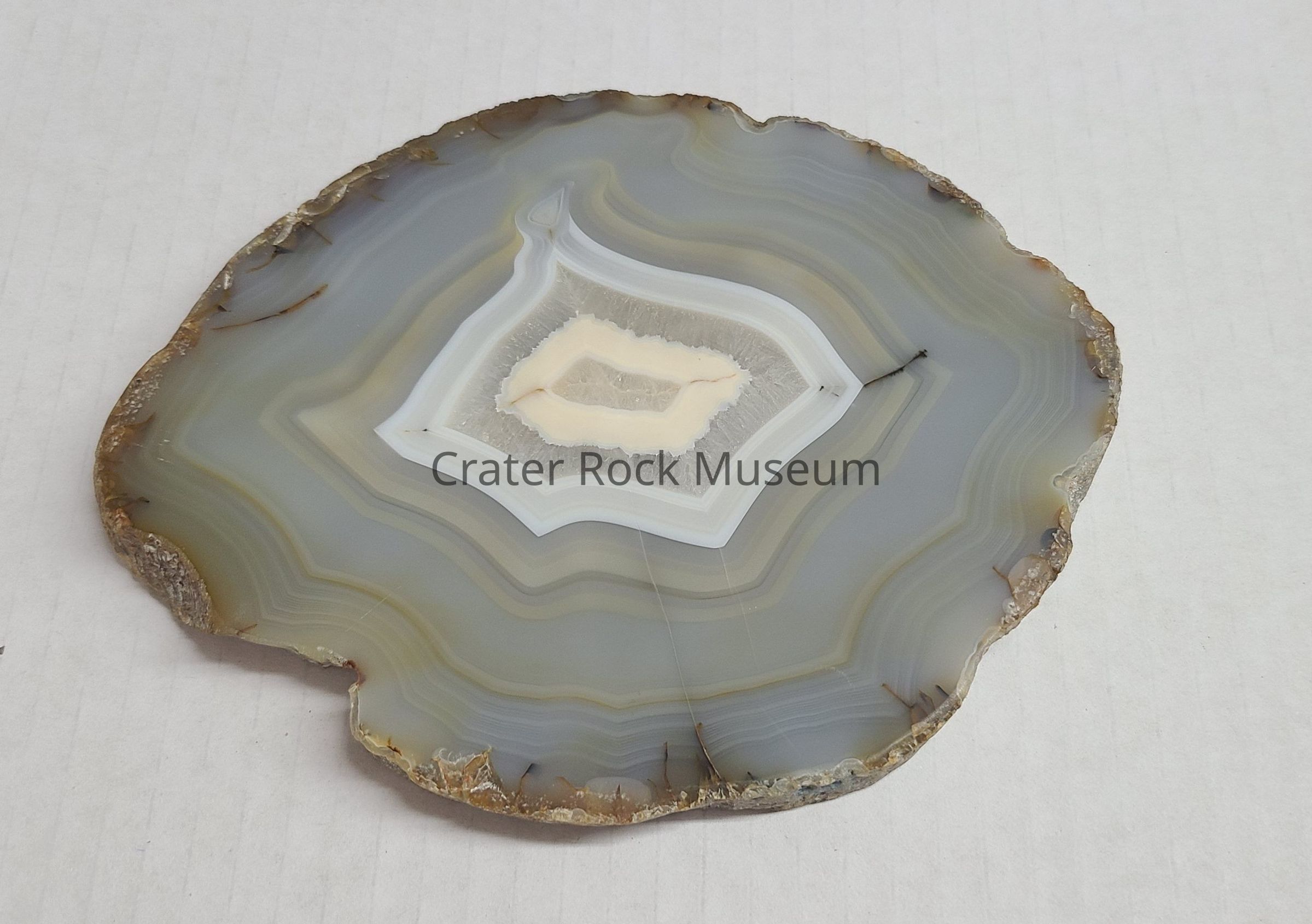 Description: A limb cast from Bear Creek, Jackson County, Oregon. Agate filled the cast after the tree rotted. Infiltration hole is apparent at one end of the center. Midmost point is silicate filled, surrounded by a white fortification band, surrounded by more silicate. A grey fortification band contains a circular spot indicating infiltration hole. Bands of various shades of blue surround cast. A crack extends halfway through the cast. Two short brown streaks are off centerLocation