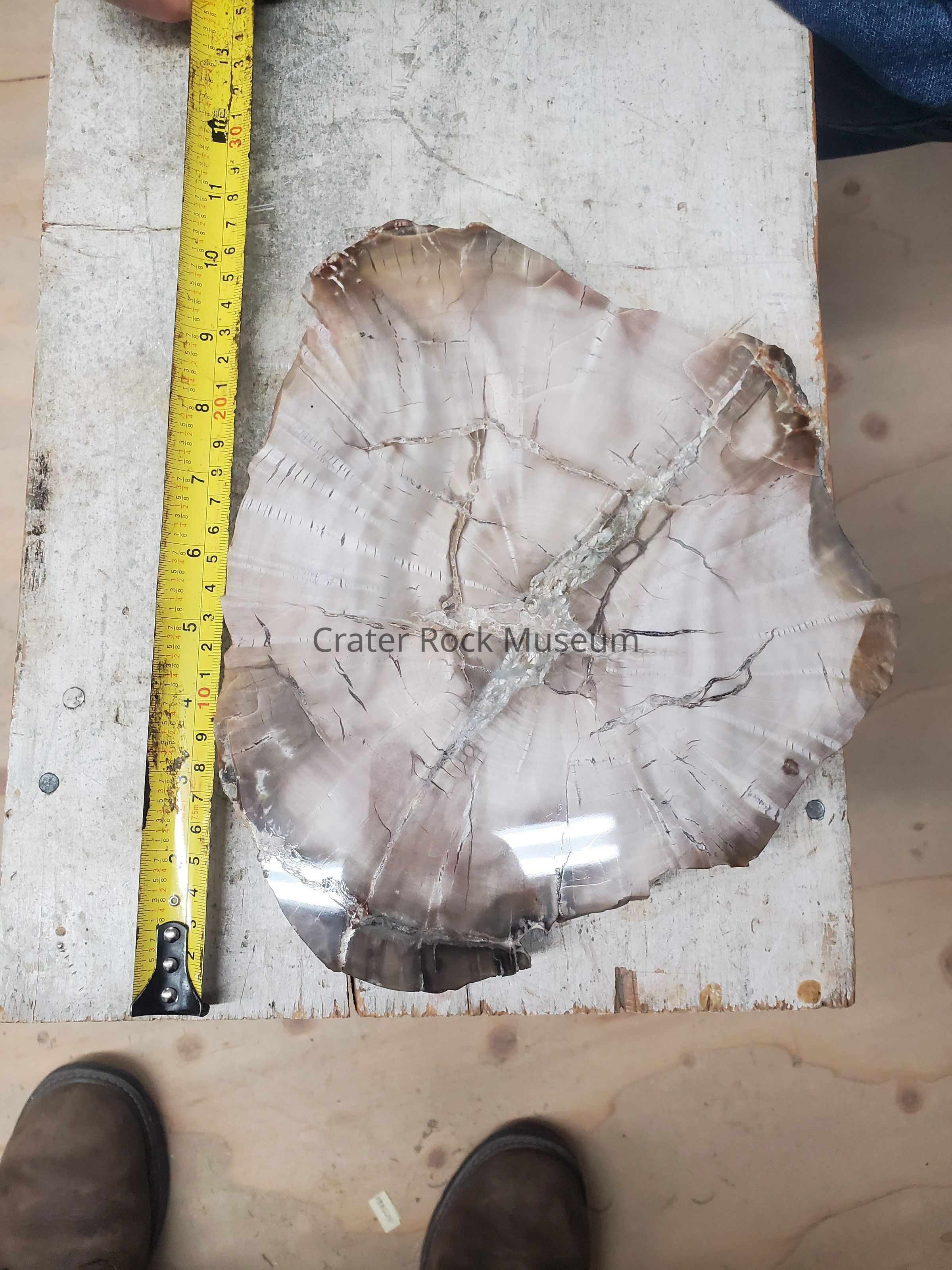 A thick slice of petrified wood known as "Woodworthia" from Arizona. Probably Jurassic period of the Mesozoic era, 180 mya, light pinkish tan in color. Lighter colored "medullary rays" very evident (rays of Parenchmatuous tissue separating the vascular bundles in stems of Dicotyledons and gymnosperms)/Collection