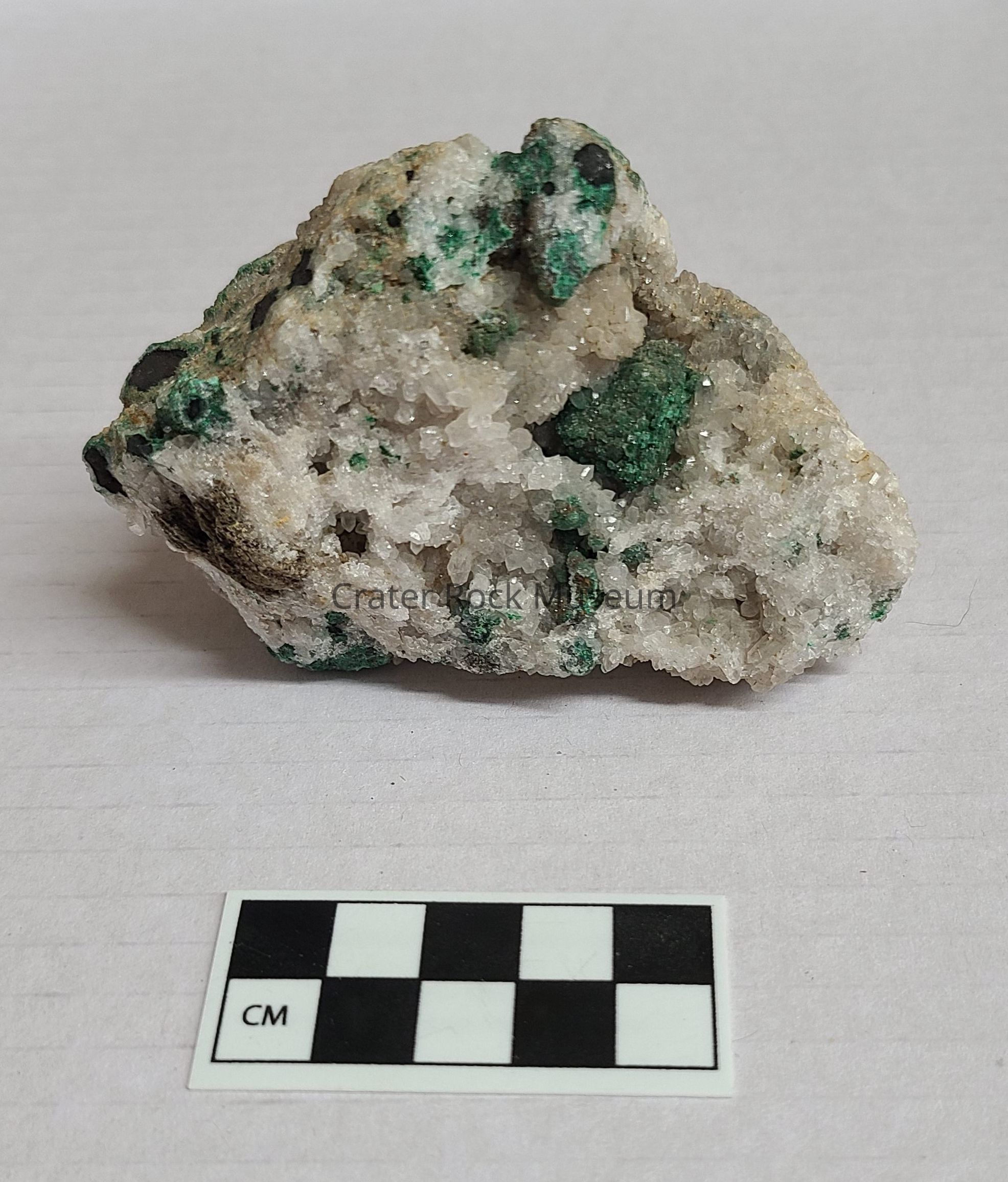 Description: Gray to white crystals of quartz with green Malachite balls all among them.