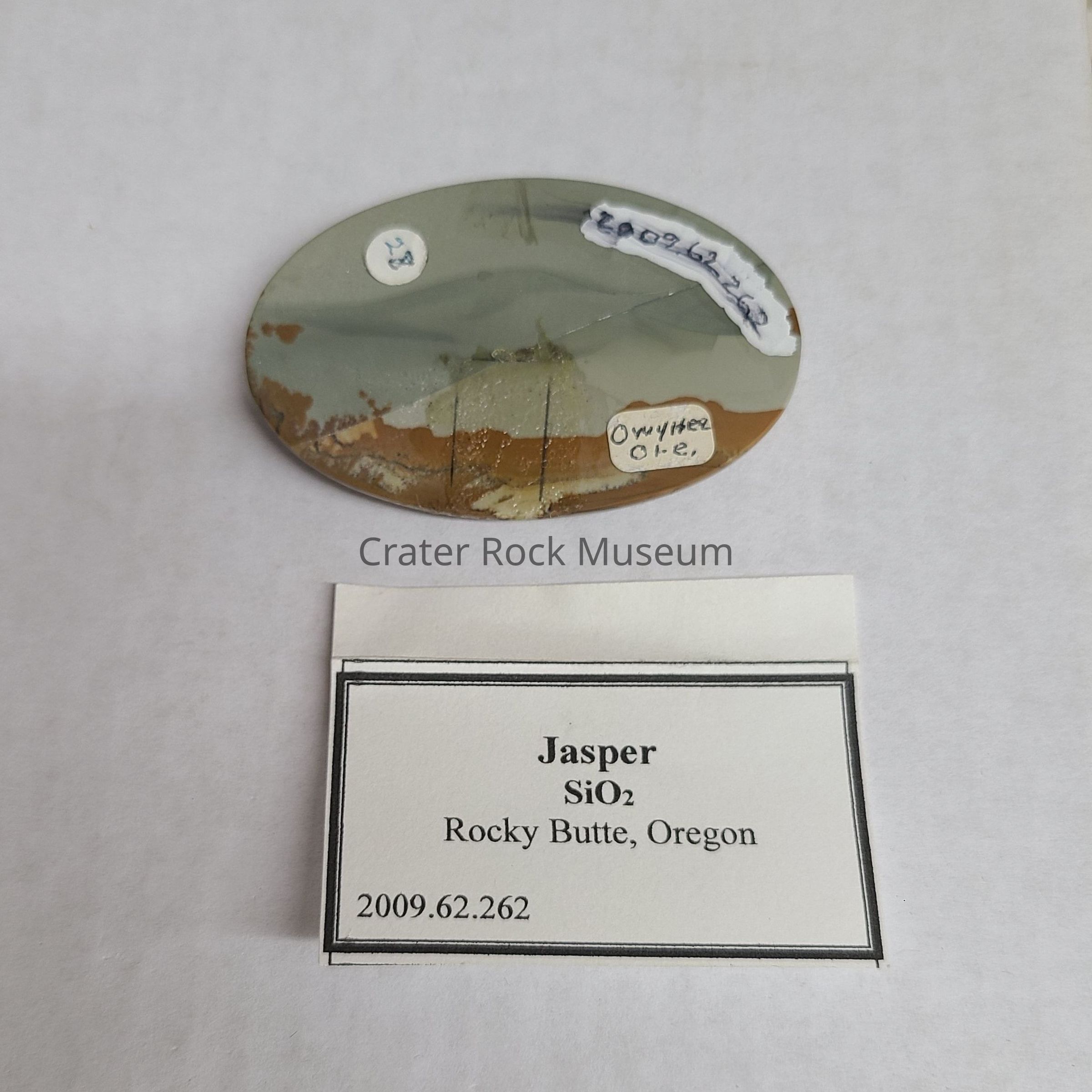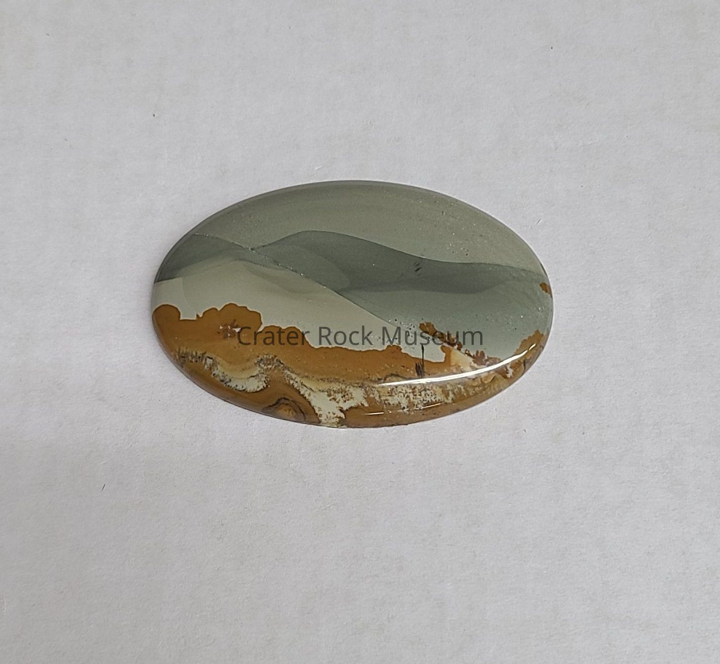 Description: Thin slab (oval) with a polished face. Burnt red to brown (foreground) and light smokey gray to bluish gray (mountains) with solid gray (sky).Collection