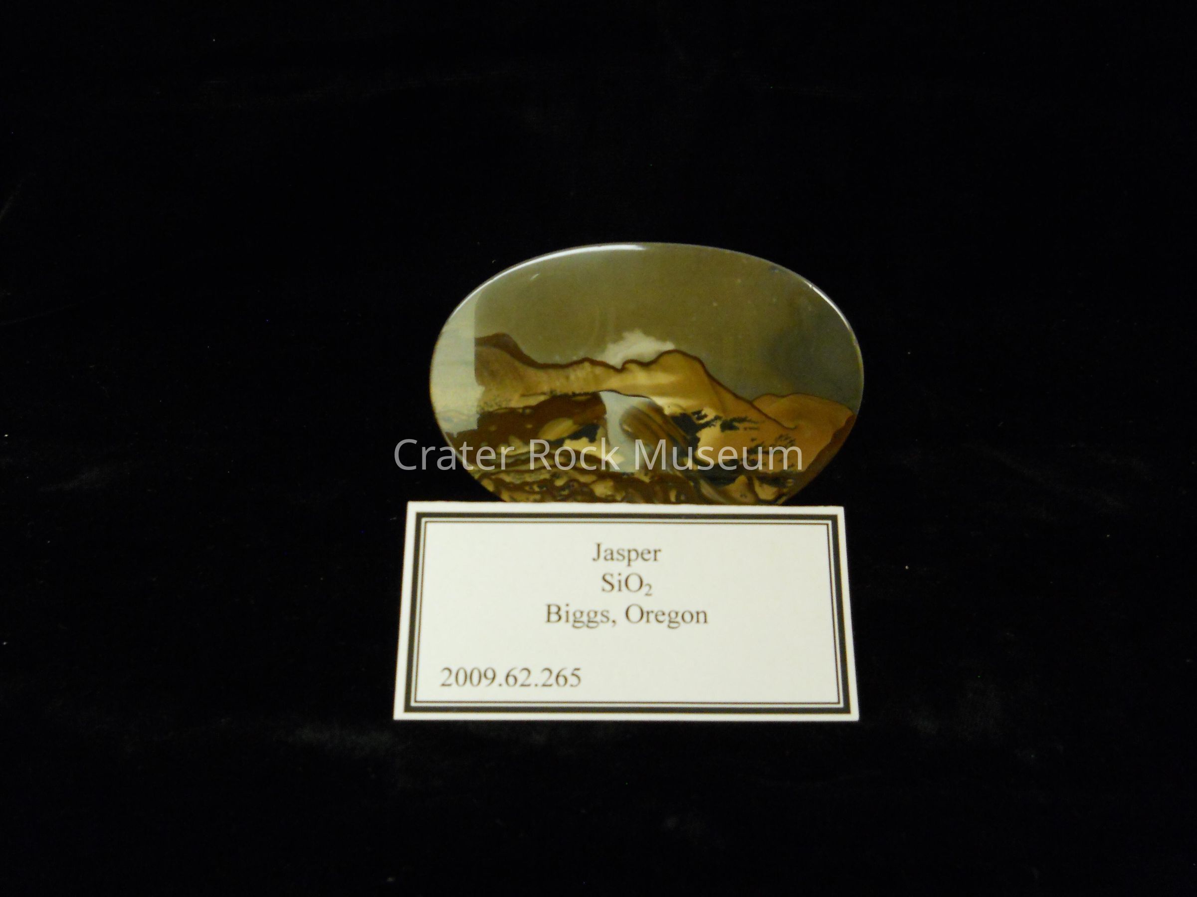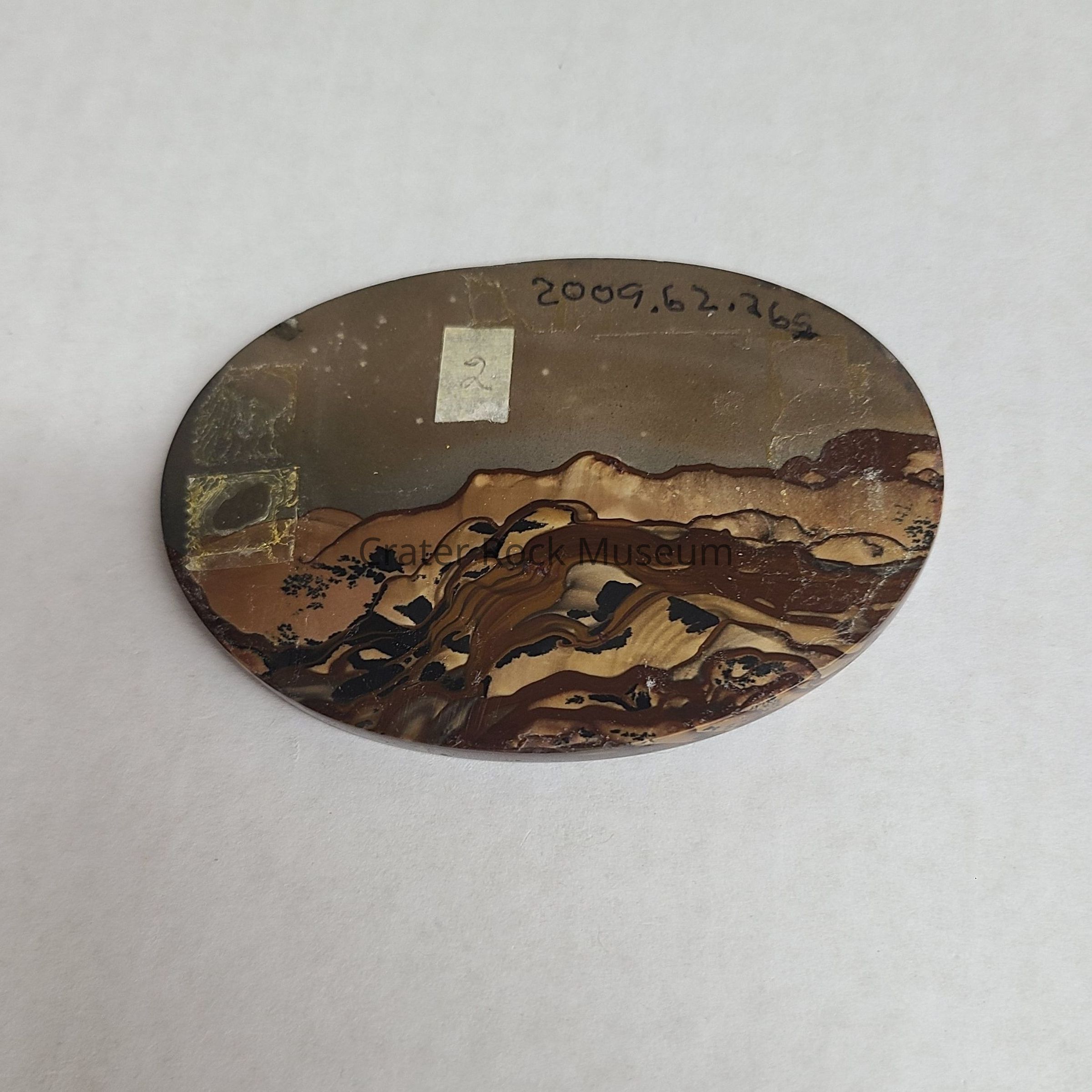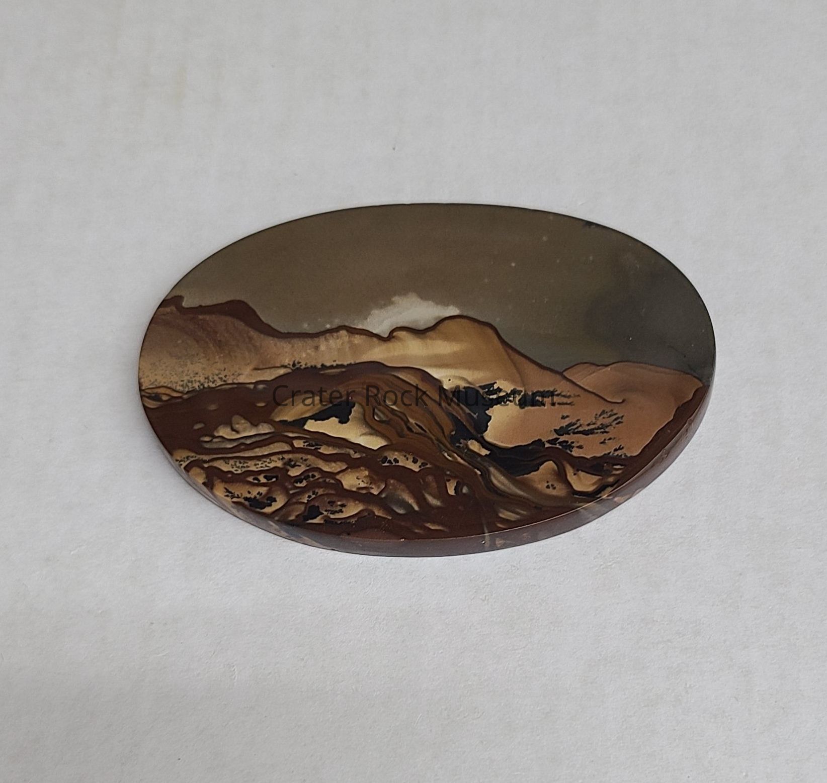 Description: Thin oval slab with polished face. Dark brown foreground with tan (mountains) on the center portion, with dark tan and dark blue (sky) in the upper region.Collection