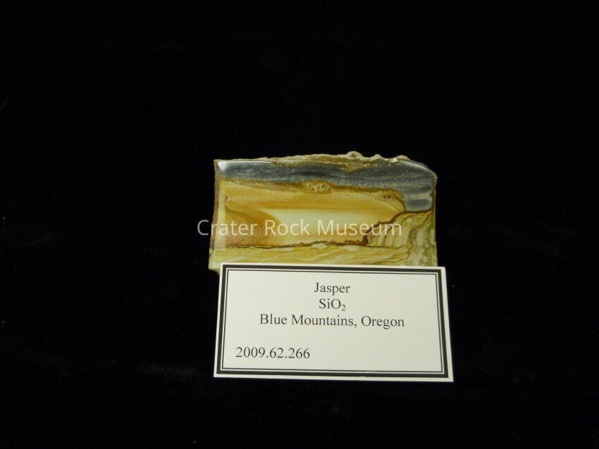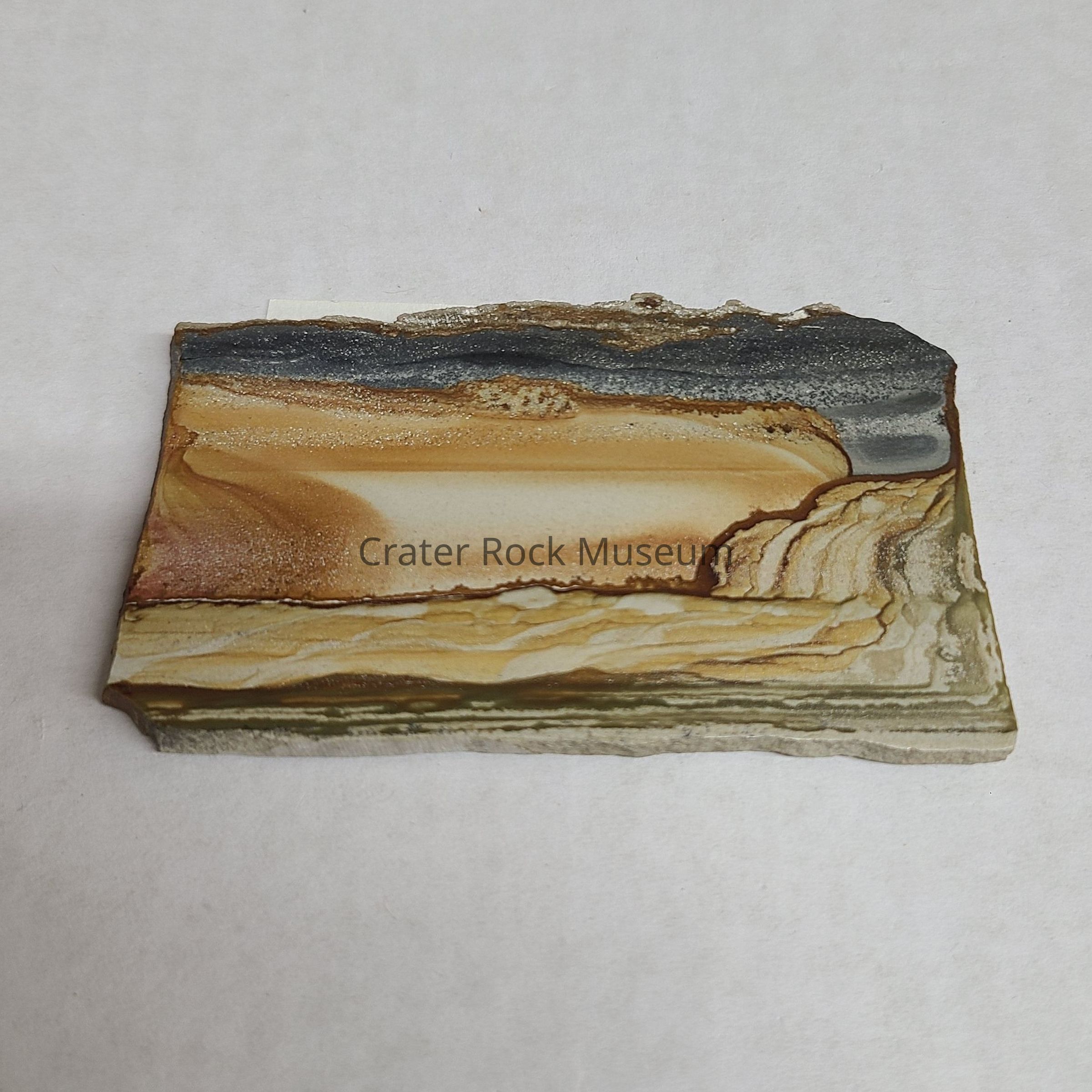 Description: Thin, rectangular slab with a polished face, rough on the top edge. Tan and brown banded foreground, a reddish-brown and creamy white center section, and a slightly banded blue top area (sky).Collection