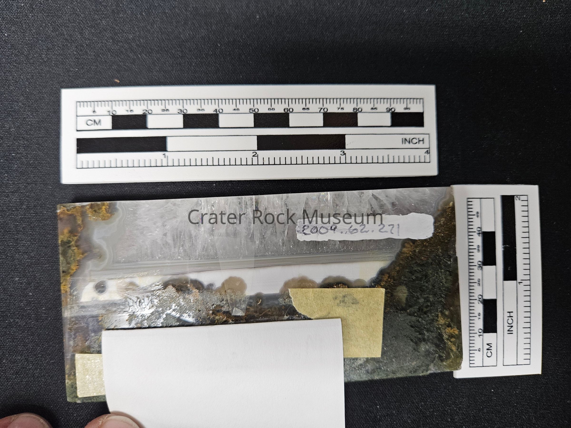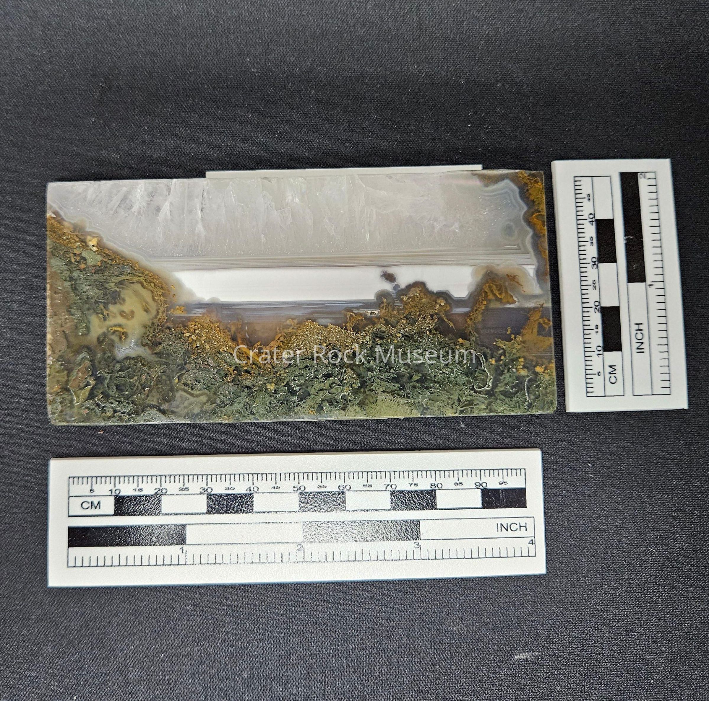 Description: Thin slab with polished face (rectangular). Translucent dark green and brown in foreground, transparent with a quartz crystalline structure on top, with a solid white streak in the middle of the specimen.Collection